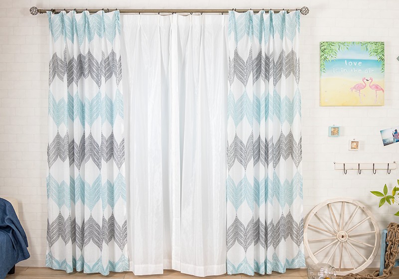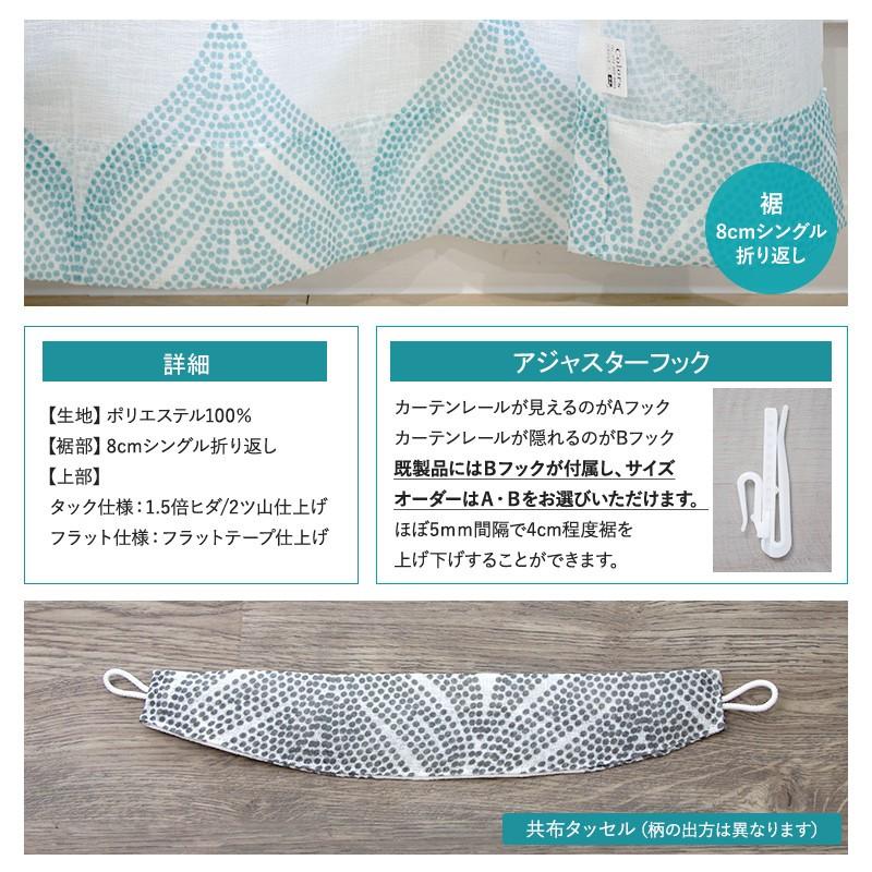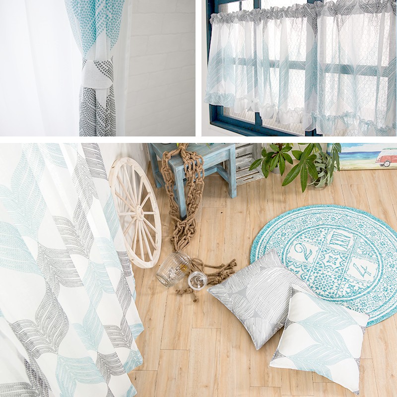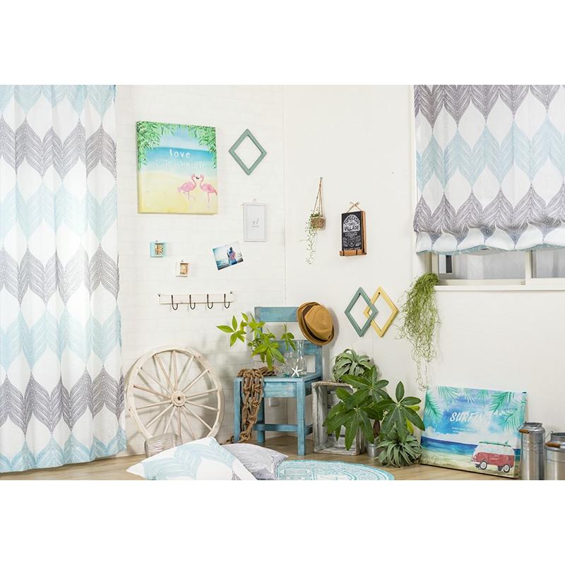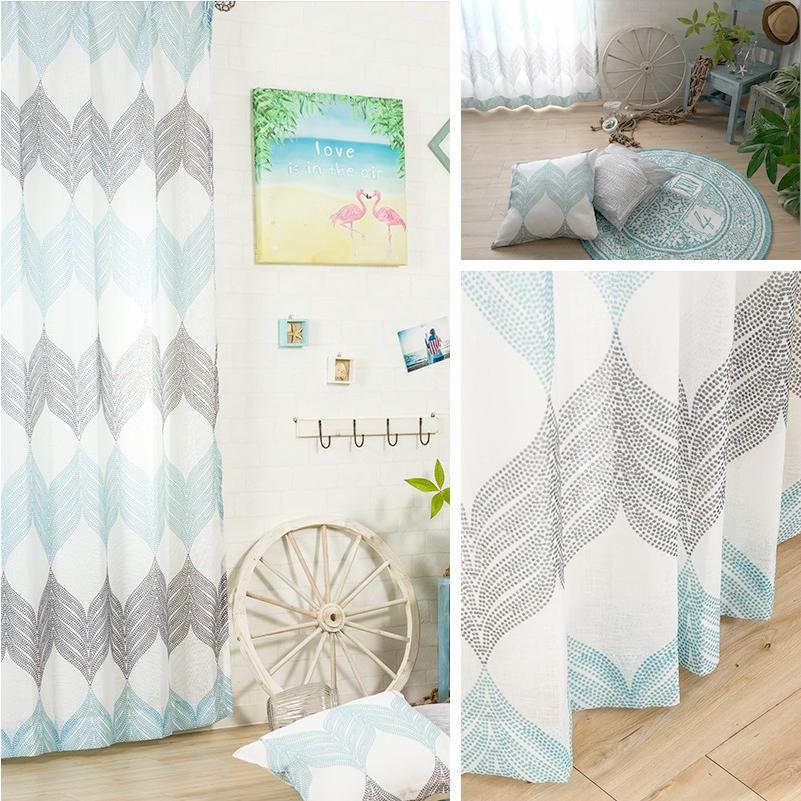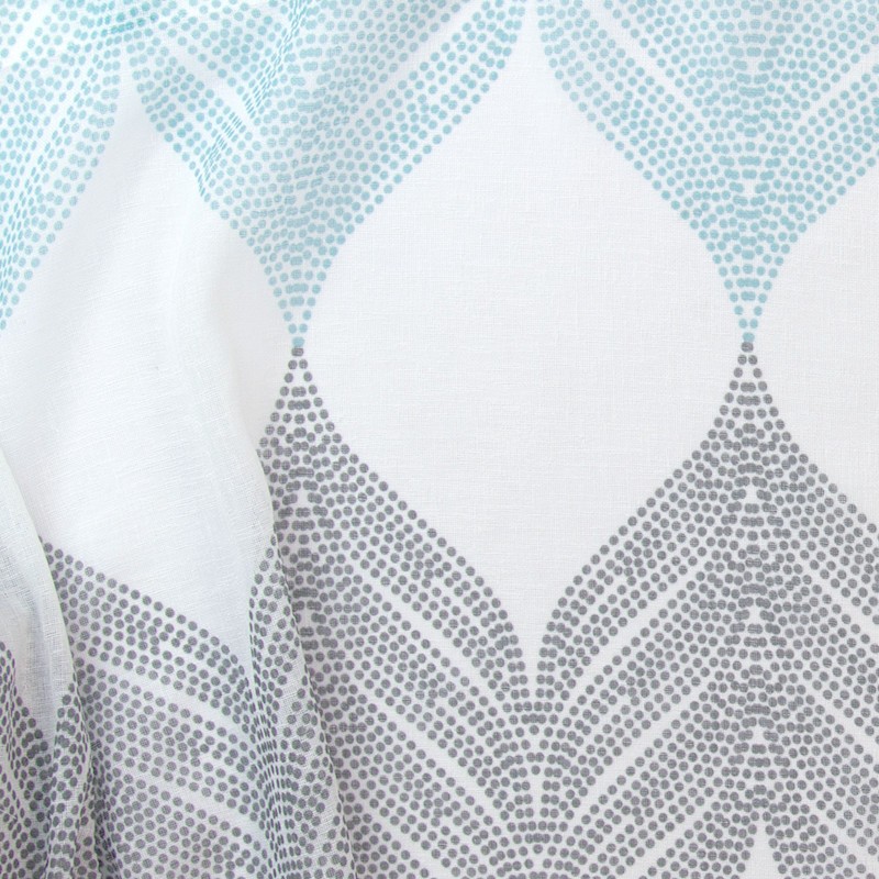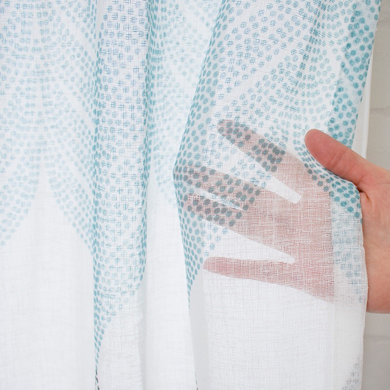淡いトーンのグレーとブルーのプリントが北欧インテリアらしいデザインで、リネンライクな軽やかさをポリエステルで表現しているのでリアルなリネンよりもお手入れしやすく、厚地カーテンと合わせてレースカーテンとしてもお使いいただけます。