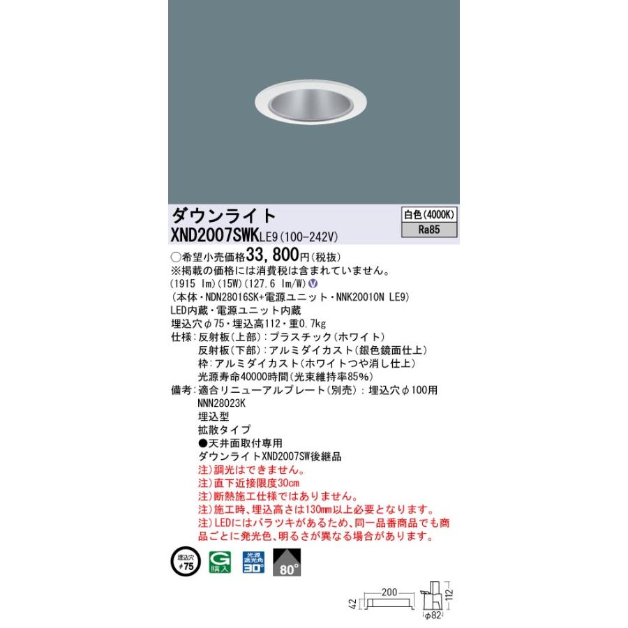 【法人様限定】パナソニック XND2007SWK LE9 LEDダウンライト 埋込穴φ75 ビーム角45度 広角 白色【NDN28011BK + NNK20010N LE9】