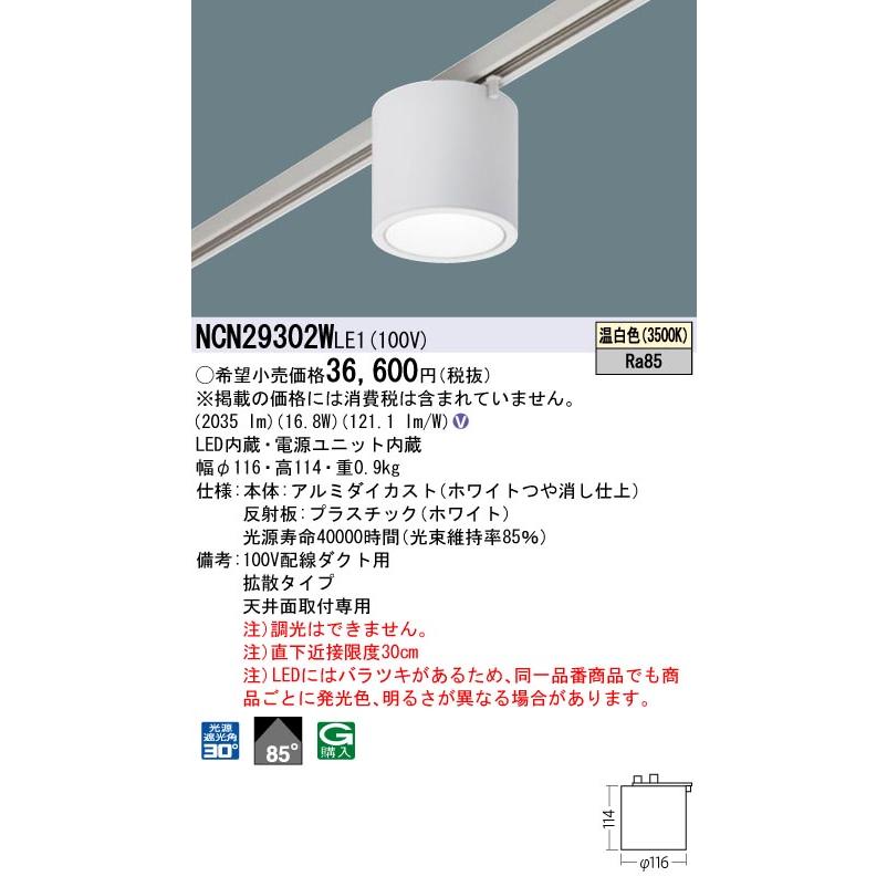 [法人限定] NCN29302W LE1 パナソニック スポットライト 天井直付 配線ダクト取付型 温白色 小型シーリングライト 拡散 光源遮光角30度 [ NCN29302WLE1 ]