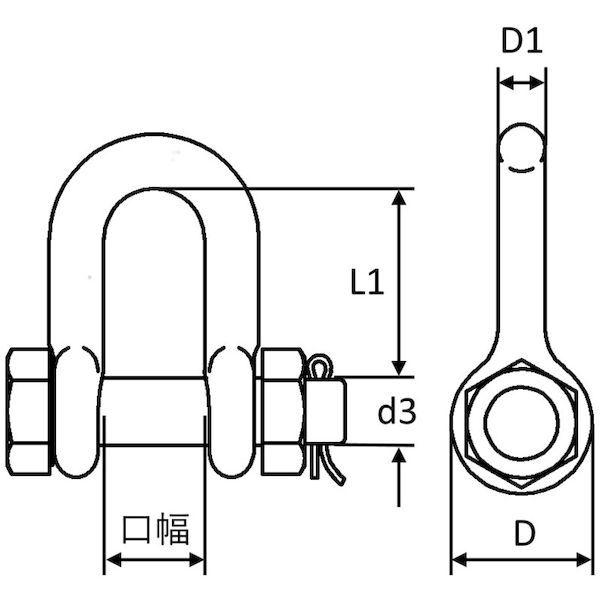 ■■■■■ご購入前に必ずご確認ください■■■■■PC ⇒ 商品ページ下部の【商品説明】の内容スマホ⇒「すべて見る」をタップし【商品説明】の内容■■■■■■■■■■■■■■■■■■■■■■■■【特長】 ●亜鉛メッキの本体と赤色のピンが特長です。 【用途】 ●荷役・運搬・土木などの現場で吊金具を始め様々な連結に。 【仕様】 ●基本使用荷重(t):8.5 ●口幅(mm):42.9 ●D(mm):60.5 ●L1(mm):81.0 ●寸法(mm)d3:28.7 ●寸法(mm)D:60.5 ●寸法(mm)D1:25.4 ●寸法(mm)L1:81.0 【仕様2】 ●ストレート・ボルトナットタイプ 【材質/仕上】 ●合金鋼 【セット内容/付属品】 ●本体1個ボルトナット1組割ピン1本 【原産国】 アメリカ"}