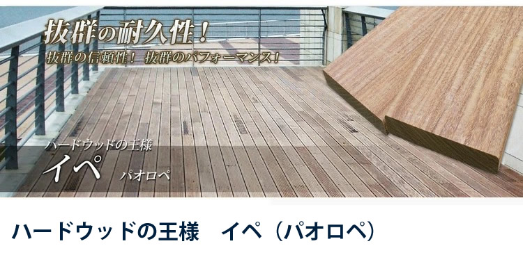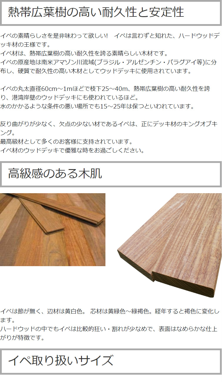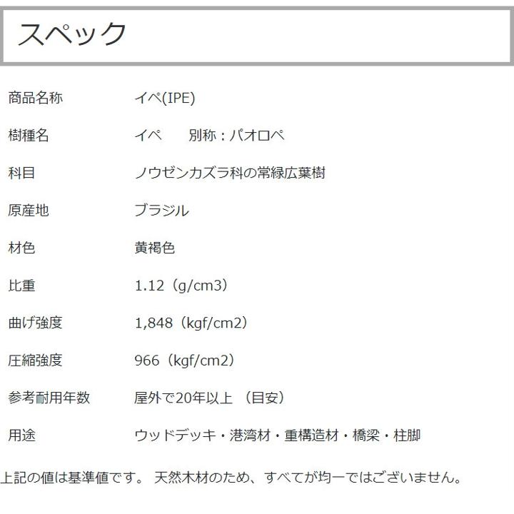 ・S4S+E4E(4面プレナー・4角面取り加工)・長さについては約10mm前後余裕を持たせて調整しております。そのためロットによって長さが若干異なります。◆イペの外観:イペは、ブラジル産のノウゼンカズラ科広葉樹で茶褐色系の色が特徴です。別名「パオロペ」とも呼ばれています。◆木材のお届け時のご注意事項・大型車でのお届けについて4t車、4tロングなどの大型車にてお届けすることが多くございます。大型車が進入できない場合は事前にお知らせください。ご連絡が無くお届け時に配送が出来なかった場合は追加の料金を頂く場合がございます。・車上渡しについてウッドデッキ材など重量物、長尺物は車上渡し(トラックの停車場所)が原則です。トラック到着の際は、荷下しのお手伝いをお願いします。玄関やお庭まで、マンションの場合はお部屋までの搬入は行っておりません。・お届け当日について通常の宅配会社さんとは違い不在時の再配達が行うことが出来ません。お届け当日は必ずご在宅頂きますようお願い致します。