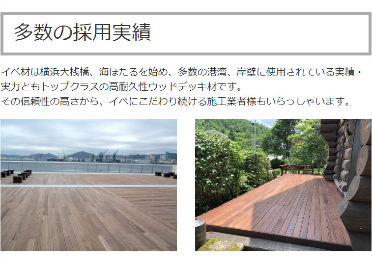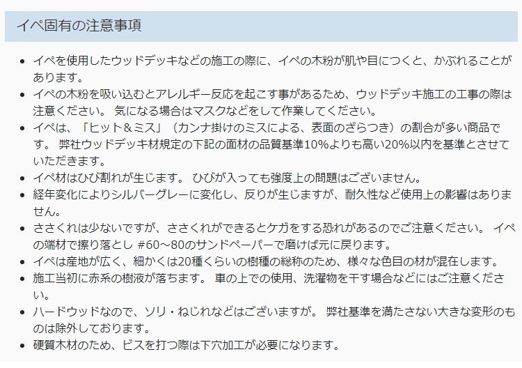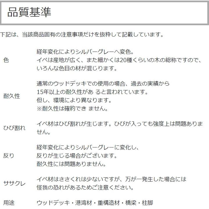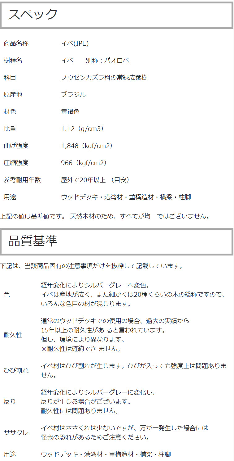 イペの詳しい品質基準は、 『デッキ材・木製フェンスの品質基準』にて詳細に記しております。