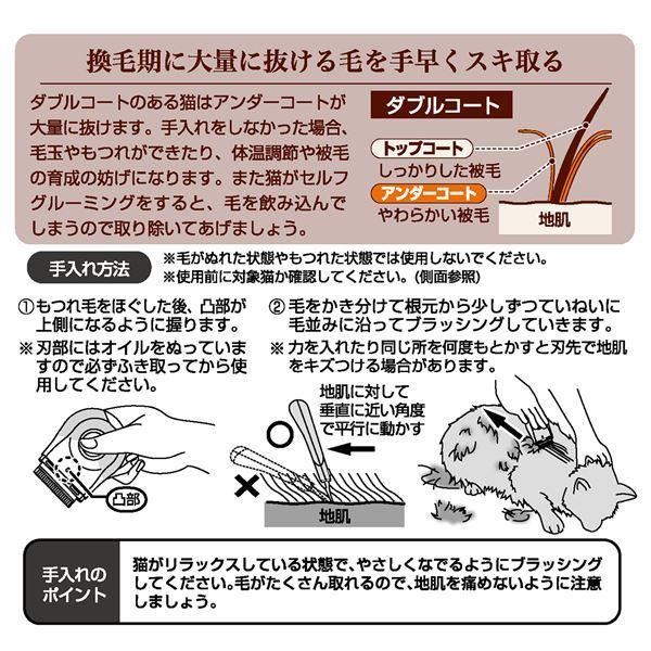 本品は猫用です。お手入れ以外には使用しないでください。生後6ヶ月未満の幼猫には使用しないでください。シングルコートの猫種や、被毛が薄い猫種には使用しないでください。人やペットが破片等を誤飲しないように注意してください。万一、誤飲した場合は各医師に相談してください。幼児・子供には使用させないでください。皮フに異常がある場合には、使用しないでください。症状を悪化させる恐れがあります。目・耳・口・肛門周辺のお手入れは各部に直接ふれないように注意してください。猫が嫌がる場合は、無理に使用しないでください。猫の皮フや被毛をキズつけたり、商品の破損につながりますので、無理な力で使用しないでください。使用前に刃の破損箇所がないか確認し、万一刃の折れや曲がり等の異常がみられた場合は使用しないでください。破損する恐れがありますので、落とさないように注意してください。水ぬれや摩擦等で色落ちする場合がありますので、注意してください。火気や水気のそばでの使用や保管はしないでください。幼児・子供・ペットのふれない所に保管してください。