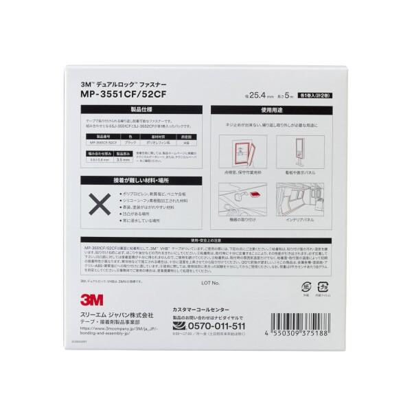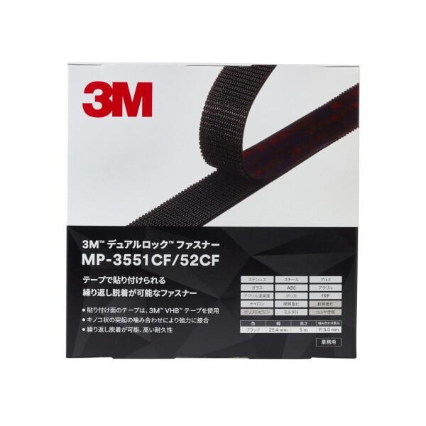 3M デュアルロック ファスナー ミニパック MP-3551CF/52CF, ブラック, 幅25.4 mm x 長さ5 m, 個装商品コード:16070844342型番:MP3551CF/52CFサイズ:幅25mmカラー:ブラック3M デュアルロック ファスナー SJ-3551CFとSJ-3552CFを組み合わせた個装品です。各幅25.4mmx長さ5m貼り付け面のテープには、3M VHB テープを採用キノコ状の突起が強力に噛み合うことで接合、繰り返し脱着が可能説明3M デュアルロック ファスナーは、オレフィン系樹脂にきのこ状のステムが突出したファスナー。本製品はSJ-3551CF(400ステム)とSJ-3552CF(170ステム)を組み合わせた個装品です。ファスナー同士を押しつけることで、きのこ状のステムが素早くかみ合います。また必要に応じて繰り返しの着脱も可能です。かみ合わせは “カチッ” という音で確認できます