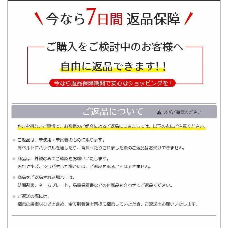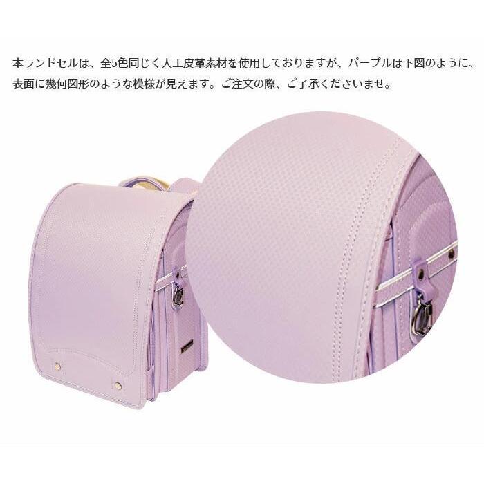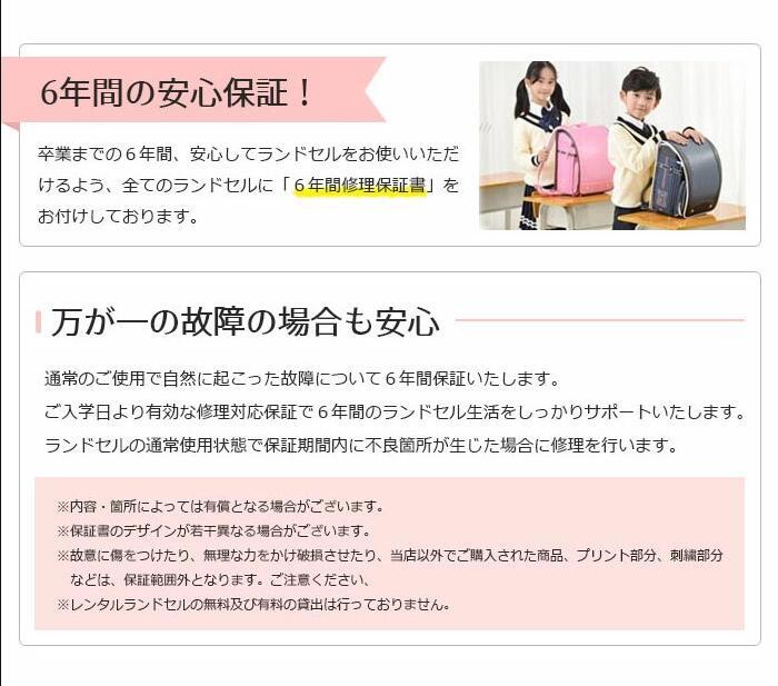 本体サイズ:外寸:約縦34cm*横26cm*奥19cm内寸(メインポケット):幅24cm ×高さ32cm×奥行12cm生産国:中国取り扱い:☆やわらかい布でから拭きしましょう☆重量:約1200g素材:タフガード(人工皮革)カラー:【ローズピンク】【ネイビー】【ワインレッド】【 ブラック】【パープル】商品特徴:●6年保証高品質で作られたランドセルとなりますので、通常6年間使用しても問題がありません。万が一故障ある場合でも安心。通常のご使用で自然に起こった故障について6年間保証致します。 ランドセルの通常使用状態で保証期間内に不良箇所が生じた場合に修理を行います。●安全かつ便利なデザインロックと反射素材付きで安全性をしっかりされています。A4ファイル対応だけでなく、いろんな用品を収納できてとても便利です。"}