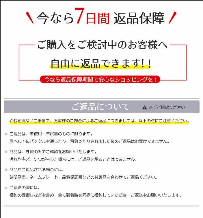 | 保証につきまして | ※通常使用状態で保証期間内に不良箇所が生じた場合に修理を行います。修理能な場合は、 同等商品との交換或いは商品の割引させていただきます。まずは当社へメールにてご連絡ください。 《 保障対象外について 》 ・故意による傷 破損 ・刺繍部分の剥げやほつれ 傷等 ・経年劣化によるハゲてるところ、汚れや傷 ・装飾金具(ファスナートップ,鋲、フック等) 故障内容により保障対象外の場合があります。 |