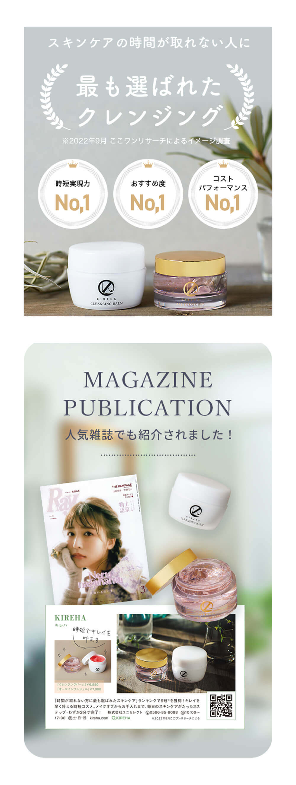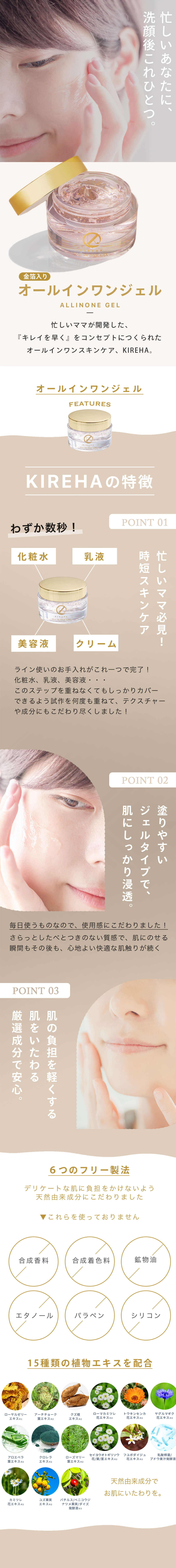 | ■スタッフによるおススメポイント | スキンケアでの必須アイテム KIREHAから忙しいママのための時短でキレイが叶うスキンケア。メイクを落としながらお顔のマッサージ、角質ケア、保湿ができるおすすめのグルコマンナン入りクレンジングバーム。 金箔入りのオールインワンジェルでしっかり保湿。 |