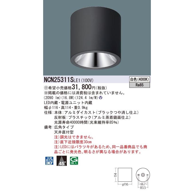 【法人様限定商品】パナソニック NCN25311SLE1 LED小型シーリングライト 天井直付型 ビーム角45度 広角 白色【受注品】