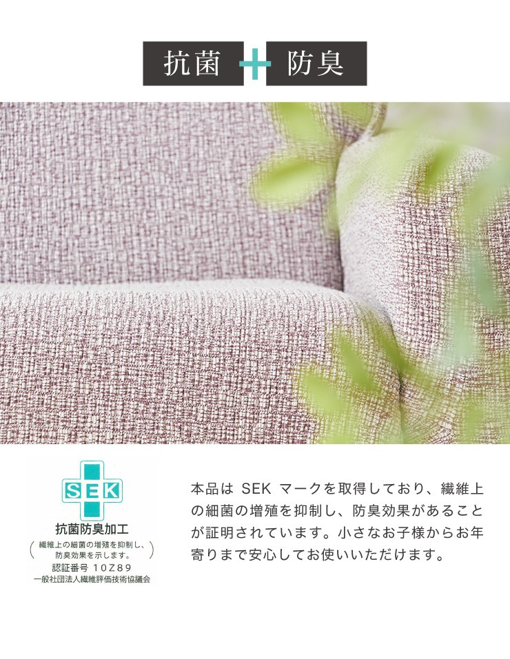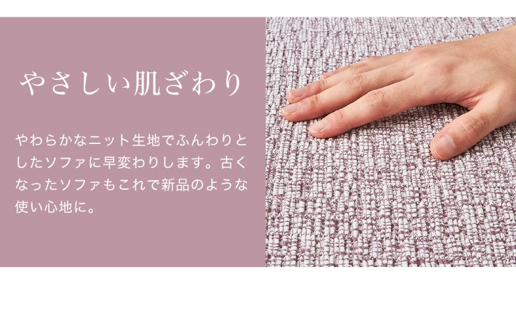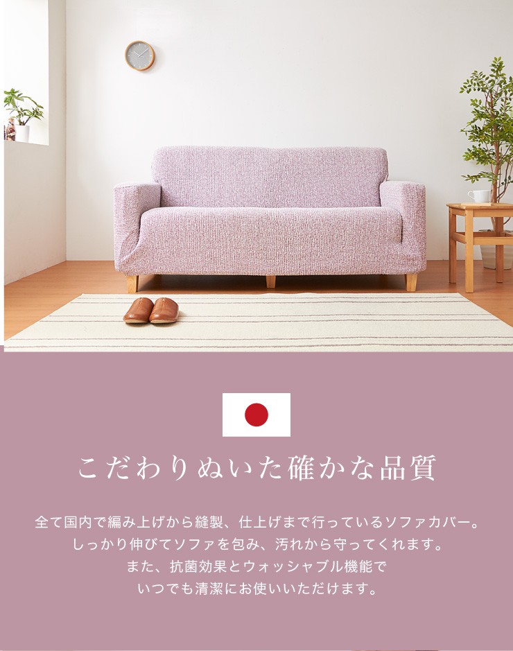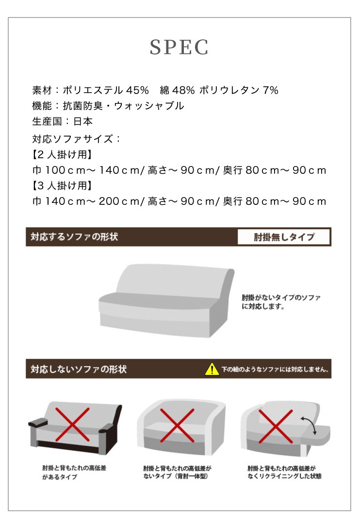【内容】psyche(プシュケ)とは、ギリシャ神話の中で人間から神になる女神のことです。のちにギリシャ語で、サナギから美しく変容する「蝶」や、変化していく「心」を意味するようになりました。純国内生産にこだわり、本物のクオリティを追求したソファカバーです。ポリエステル素材がほとんどの従来人のソファカバーに対して、コットン比率を大幅にアップすることで抜群の肌触りと吸湿性を実現しました。またいつでも快適にご愛用していただけるようにも施してあります。高いストレッチ性で多くのソファにぴったりとフィットします。お手持ちのソファの汚れ防止はもちろん、時期に合わせたドレスアップとしても、是非ご活用ください。新開発素材を採用しています。収縮率180%の贅沢なストレッチ素材を使用。綿を76%配合した極上の肌触りと抜群の吸湿性で熱のこもりやすいウレタンや化繊、合成皮革等のソファに最適です。●素材ポリエステル45% 綿48% ポリウレタン7%●機能(SEKマーク取得)・ウォッシャブル<対応ソファサイズ>肘無2人掛け用)巾100cm〜140cm/高さ〜90cm/奥行80cm〜90cm"}