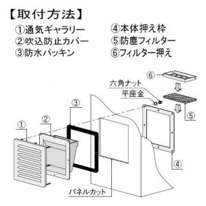 ●セット内容:通気ギャラリー、吹込防止カバー、本体押え枠、防水パッキン、防塵フィルター、フィルター押え