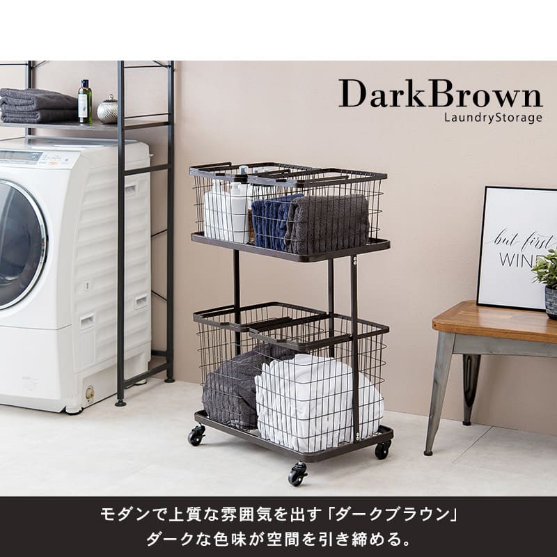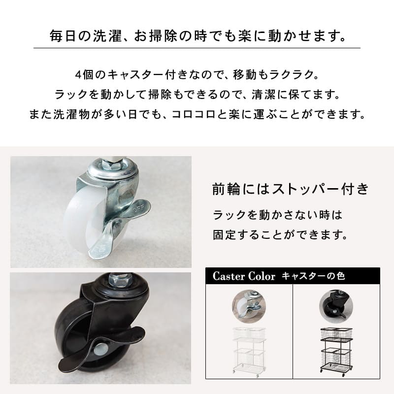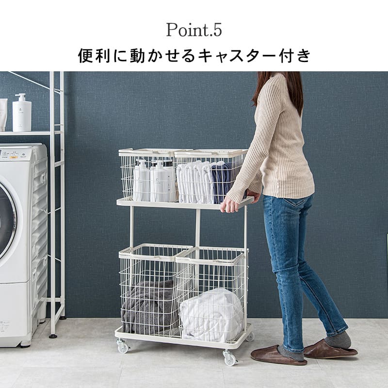 色柄物や汚れた洗濯物を分けて溜められるランドリーワゴン。バスケットは持ち運べて便利。
