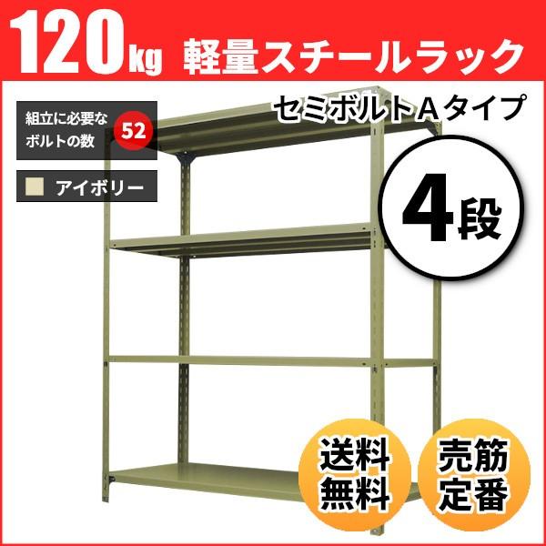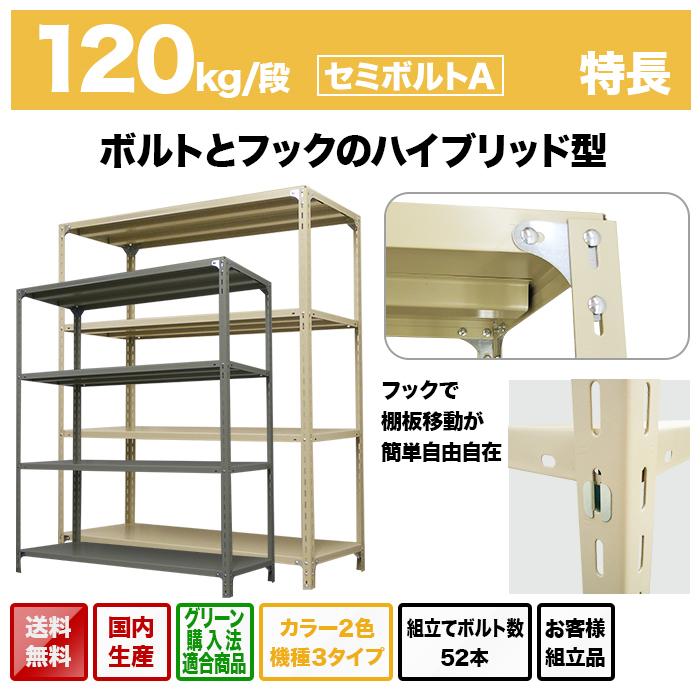 【軽量スチールラック セミボルトAタイプの特長】・上下棚板の組立はボルトタイプと共通ですが、中棚板の取り付けに「ワンタッチフック」を使用する為、棚板の移動が簡単です。・ワンタッチフックの分ボルトナットが少ないので、ボルトタイプに比べ組立てが簡単にできます。商品名:業務用スチールラック 120kg/段 セミボルトAタイプ表示寸法:高さ2400×間口875×奥行450mm実寸法:高さ2401×間口885×奥行460mm段数:4段重量:26kg最大耐荷重:120kg(棚板1枚当たり)最大均等積載荷重:MAX500kg(1台当たり)主材料:スチール(鉄)カラー:アイボリー/グレー塗料:高級メラミン焼付け塗装生産国:日本(国産品)梱包と出荷形状:部材・部品のダンボール簡易包装(お客様組立品)専門店だからできる国産・高品質の業務用スチール棚を低価格で翌日出荷!●低価格で国産・高品質の業務用スチール棚●揺れに強い3本爪の唯一のスチールラック●在庫があれば翌日出荷!送料無料!●大型物件にも対応可能!まとめ買い割引きも!"}