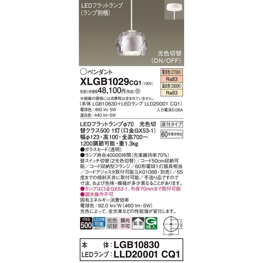 パナソニック XLGB1029CQ1 ペンダントライト 吊下型 LED(温白色・電球色) ガラスセードタイプ・拡散タイプ・直付タイプ 光色切替(ON/OFF) 透明