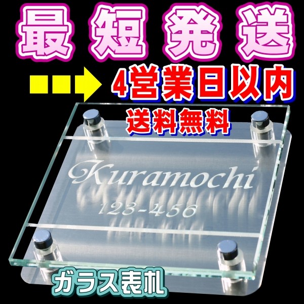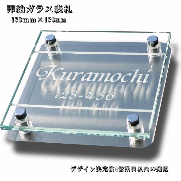 表札 ガラス(人気表札)人気のガラス表札に130mm角が新登場!標準でステンレスプレートが付きます。デザイン表札ならではのおしゃれな表札。デザインも豊富でお好みの表札になります。ステンレスプレートのコーナーはR加工仕上げサイズ:130mm×130mm 全体の厚みは化粧ビスを除き17mmステンレスはSUS304を使用して錆び難い仕様。ステンレスコーナーにはR加工を施し高級感を演出。クリアガラス、ステンレス(SUS304ヘアーライン)、版下代、彫刻代等全て付いております。色入れ無しフロスト文字限定デザインも校正まで合わせて3つまで無料穴あけが出来ない場所への取り付けにはオプションでフラット金具もあります。(標準付属のビスと交換となります)当店お勧めのガラス表札最短発送の表札【デザイン決定後、土・日・祝を除く4営業日以内で発送】"} お客様から、もっと早く表札の製作が出来ないかとのご要望に当店は答えます!