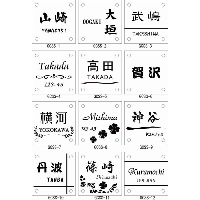 | ガラス表札 仕様 【表札のサイズ】 130mm×130mm 全体の高さ17mm(取付金具は除く)(ガラス厚6mm) 【表札のガラス】 日本製建築ガラス (クリア仕様) サイド透過仕上げ 【表札のステンレス】 SUS304ヘアーライン コーナーR加工 色:シルバー 厚み: 1mm 【表札の彫刻方法】 裏彫り限定 (色入れ無しフロスト文字限定:色落ち色褪せが無い仕様です) 【表札のデザイン】 校正を含めて3回まで無料 (4校正目より1デザインにつき、1,050円) 【表札の取付金具】 化粧ビス 中空壁〜真壁まで接着剤不要で取り付け可能 標準ビスどめタイプ 【表札の特典】 版下代、彫刻代、製作料も全てご購入代金に含みます。 【発送目安】 デザイン決定後翌日より4営業日以内で発送 表札 製作サンプル写真の仕様 【デザイン番号】 GCSS-12 【書体番号】 M40 |