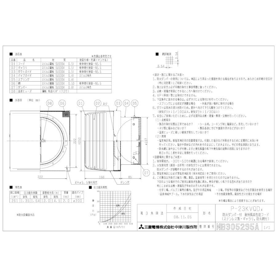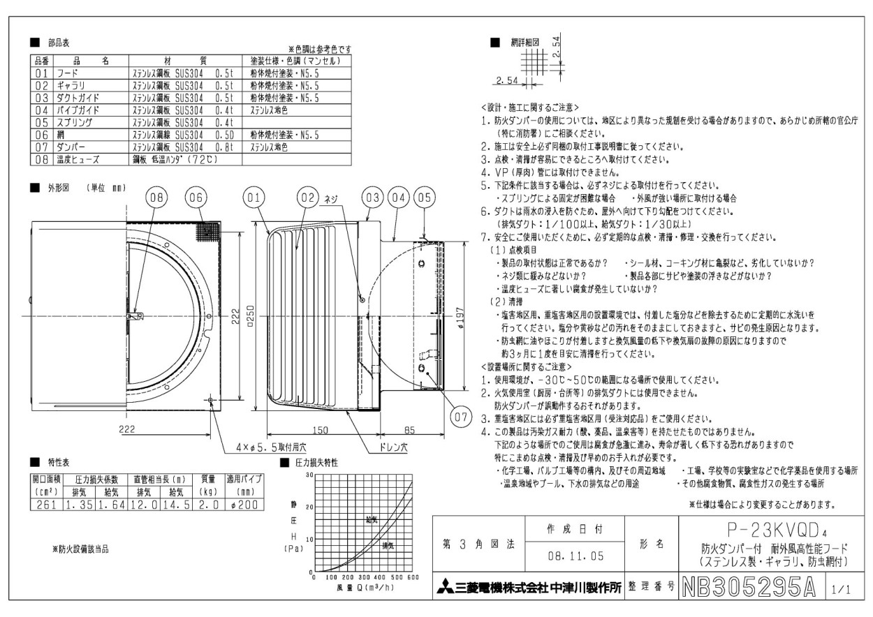 三菱電機 P-23KVQD4 防火ダンパー付耐外風高性能フード(ステンレス製・ギャラリ・防虫網付) ダクト用システム部材