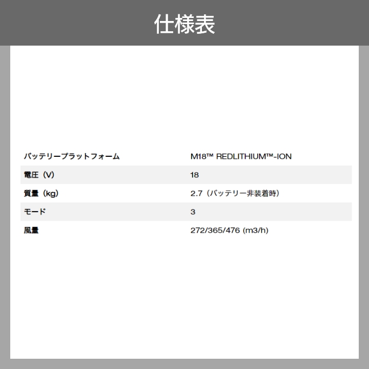 製品仕様バッテリープラットフォーム:M18 REDLITHIUM-ION電圧(V):18質量(kg):2.7(バッテリー非装着時)モード:3風量:272/365/476 (m3/h)ミルウォーキー 18V 扇風機 業務用 産業扇 充電式 ファン バッテリー式 夏 扇風機 産業用 涼風 作業現場 工事現場 レジャー 真夏