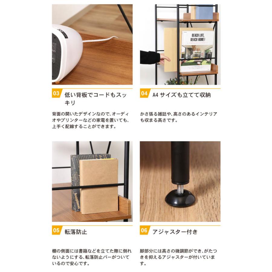 | 細身のスチールフレームと美しい木目模様の棚板ですっきり魅せて収納するマルチシェルフ。 シンプルで使いやすいデザインは置く場所や使い道を選びません。 視線を遮らない背面と側面の開いたオープンシェルフなので、お部屋が広く明るく感じられ、圧迫感を抑えた空間に。 棚の側面には、書籍などを立てた際に倒れないよう、転倒防止バーが付いています。 脚部にはアジャスターが付いており、気になるがたつきを抑えます。 |