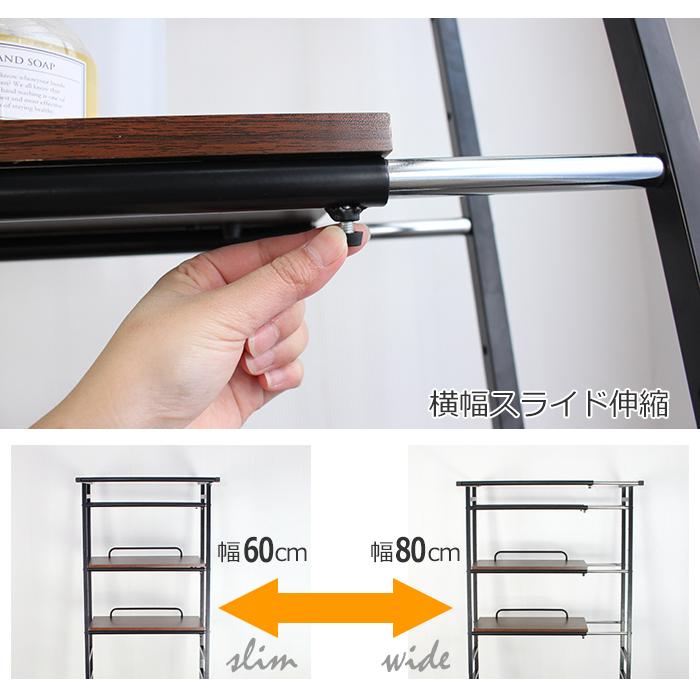 幅は伸縮式、棚受けは可動式なのでお好みの位置で使用できます。