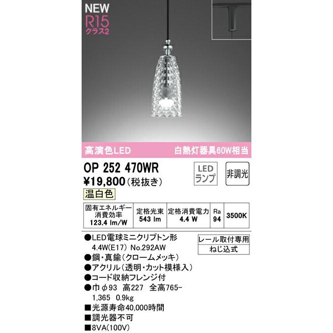 【決済・後払い決済】 高演色LED 白熱灯器具60W相当 OP252470WR 温白色 消費電力4.4W Ra94 ●LED電球ミニクリプトン形 4.4W(E17) No.292AW ●・真鍮(クロームメッキ)●アクリル(透明・カット模様入) ●コード収納フレンジ付 ●巾φ93 高227 全高765-1,365 0.9kg ■光源寿命40,000時間 ■調光器 レ-ル取付専用 ねじ込式 その他メーカーへのお問い合わせはコチラ →