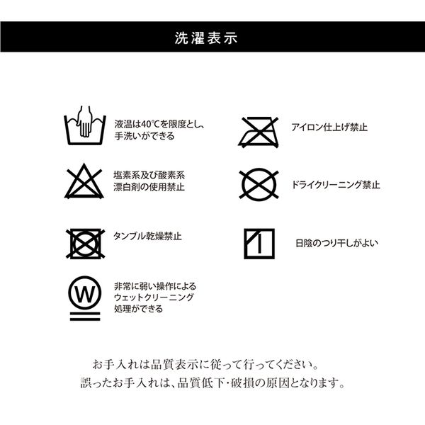 | 洗濯表示 | 40度以下の水温で、弱い手洗いがよい。(洗濯機は使用できない) |