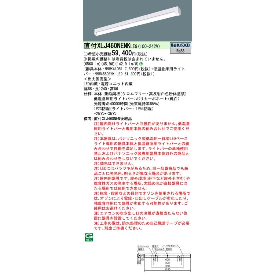 [法人限定] XLJ460NENK LE9 パナソニック 低温倉庫用 天井直付型 40形 一体型LEDベースライト 防湿型