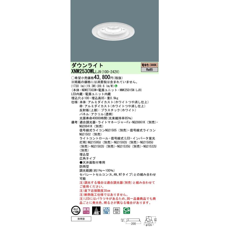 パナソニック XNW2530WL LJ9 LED 電球色 ダウンライト 浅型10H ビーム角45度 防雨型 調光型 埋込穴φ100 水銀灯100形1灯相当 本体+電源ユニット