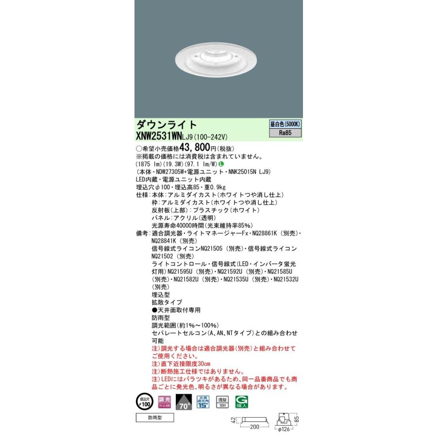 パナソニック XNW2531WN LJ9 LED 昼白色 ダウンライト 浅型10H ビーム角70度 防雨型 調光型 埋込穴φ100 水銀灯100形1灯相当 本体+電源ユニット