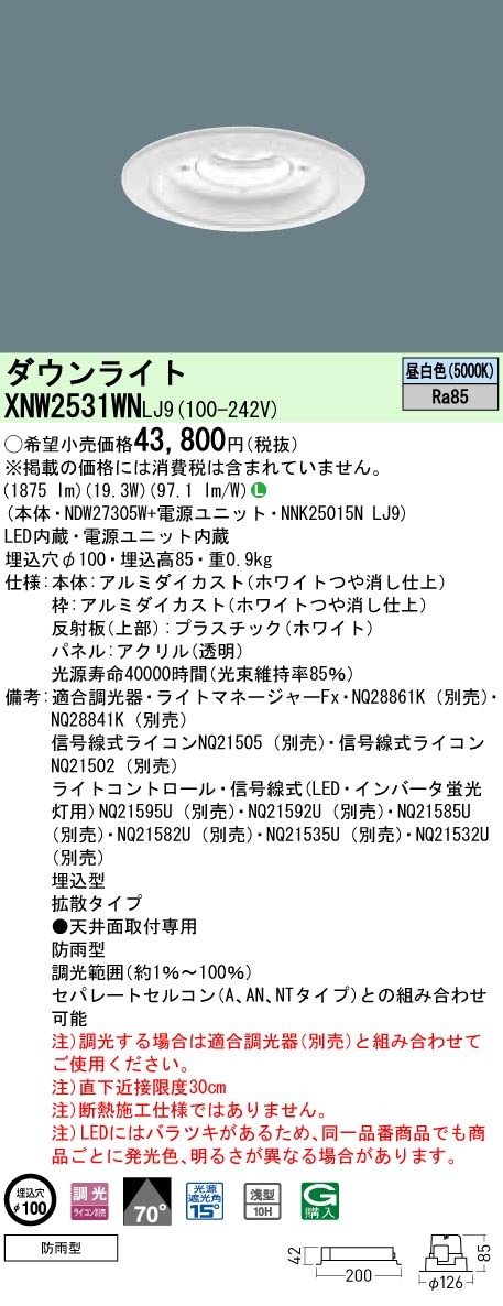 XNW2531WN LJ9 軒下用ダウンライトLED内蔵、電源ユニット内蔵【本体】NDW27305W【電源ユニット】NNK25015N LJ9光源◆LED(昼白色) ◆色温度:5000 K ◆光源寿命40000時間(光束維持率85%)寸法・質量◆埋込穴径:φ100 mm ◆埋込高:85 mm◆質量:0.9 kg仕様◆器具光束:1875 lm ◆電圧:100〜242 V ◆消費電力:19.3 W ◆消費効率:97.1 lm/W◆【本体】アルミダイカスト(ホワイトつや消し仕上)◆【枠】アルミダイカスト(ホワイトつや消し仕上)◆【反射板(上部)】プラスチック(ホワイト)◆【パネル】アクリル(透明)◆Ra85◆埋込型◆拡散タイプ 光源遮光角15度◆●天井面取付専用◆防雨型◆調光範囲(約1%〜100%)◆セパレートセルコン(A、AN、NTタイプ)との組み合わせ可能◆調光する場合は適合調光器(別売)と組み合わせてご使用ください。◆直下近接限度30cm◆断熱施工仕様ではありません。