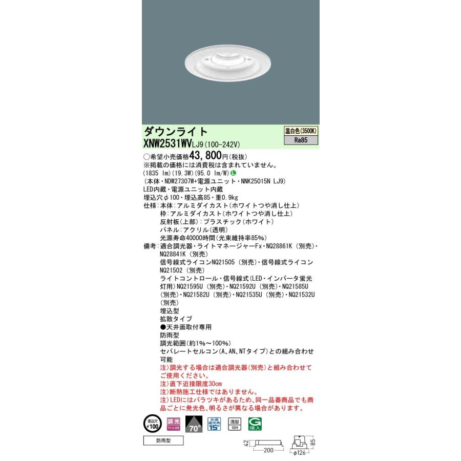 パナソニック XNW2531WV LJ9 LED 温白色 ダウンライト 浅型10H ビーム角70度 防雨型 調光型 埋込穴φ100 水銀灯100形1灯相当 本体+電源ユニット