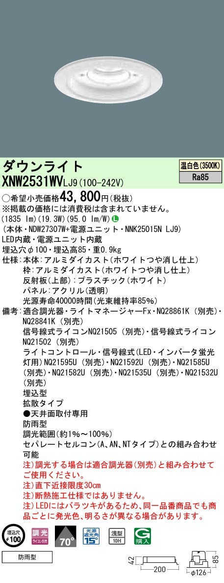 XNW2531WV LJ9 軒下用ダウンライトLED内蔵、電源ユニット内蔵【本体】NDW27307W【電源ユニット】NNK25015N LJ9光源◆LED(温白色) ◆色温度:3500 K ◆光源寿命40000時間(光束維持率85%)寸法・質量◆埋込穴径:φ100 mm ◆埋込高:85 mm◆質量:0.9 kg仕様◆器具光束:1835 lm ◆電圧:100〜242 V ◆消費電力:19.3 W ◆消費効率:95 lm/W◆【本体】アルミダイカスト(ホワイトつや消し仕上)◆【枠】アルミダイカスト(ホワイトつや消し仕上)◆【反射板(上部)】プラスチック(ホワイト)◆【パネル】アクリル(透明)◆Ra85◆埋込型◆拡散タイプ 光源遮光角15度◆●天井面取付専用◆防雨型◆調光範囲(約1%〜100%)◆セパレートセルコン(A、AN、NTタイプ)との組み合わせ可能◆調光する場合は適合調光器(別売)と組み合わせてご使用ください。◆直下近接限度30cm◆断熱施工仕様ではありません。