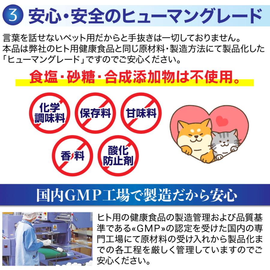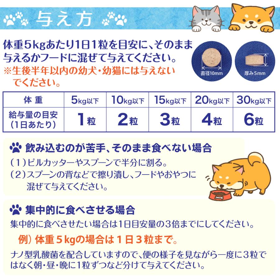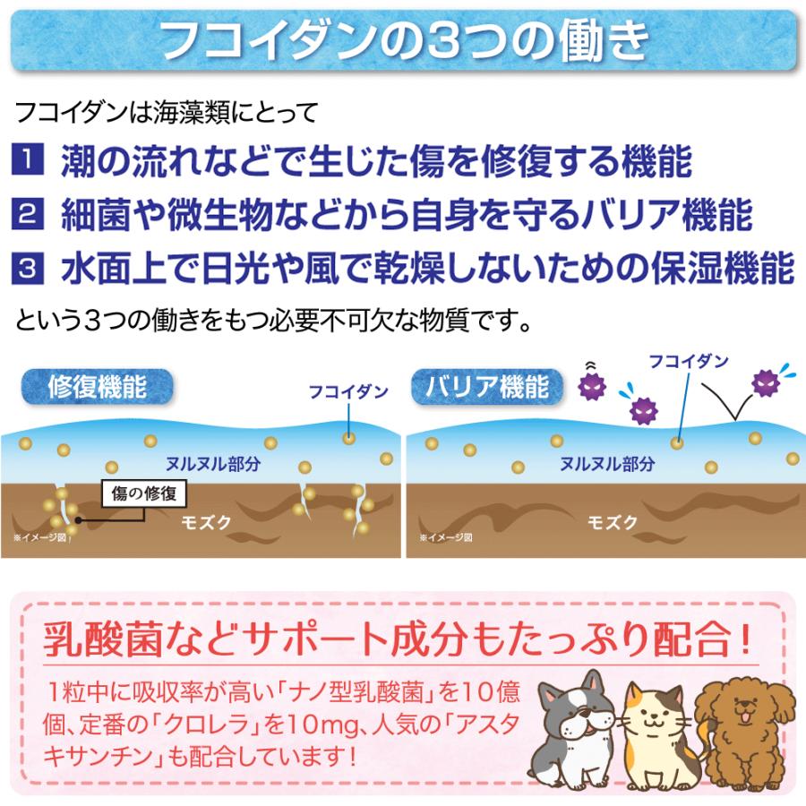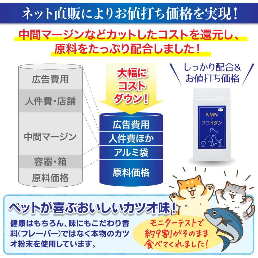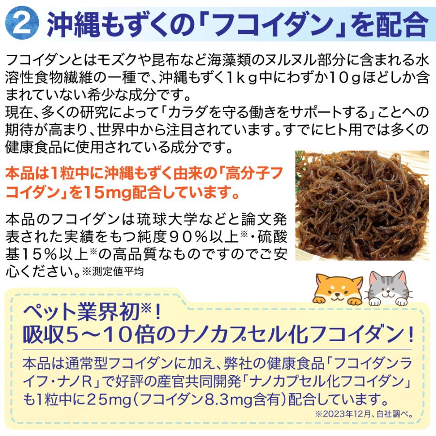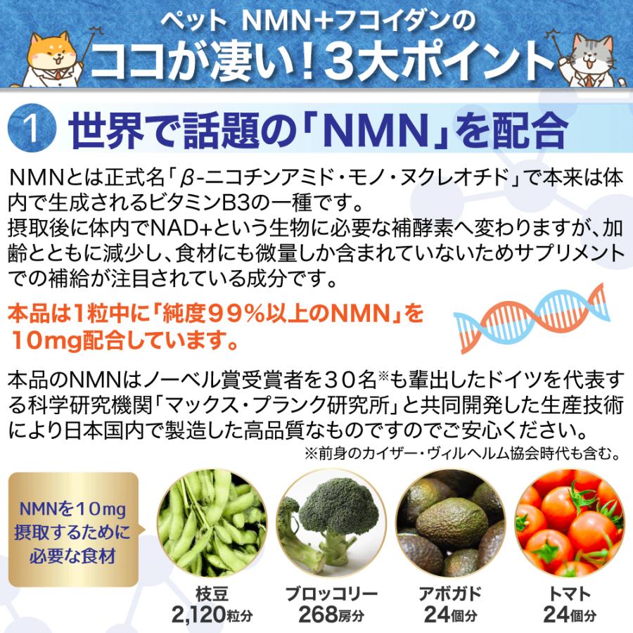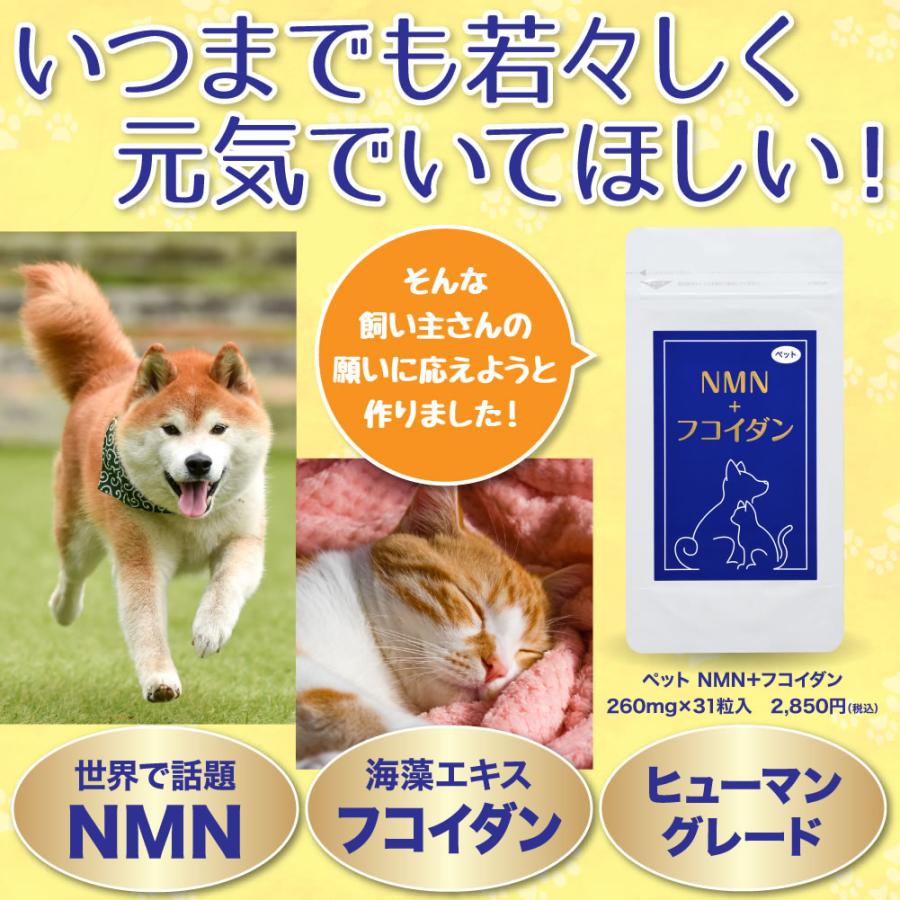 年齢と闘う大切な家族に「いつまでも若々しく、元気でいてほしい!」多くの飼い主さんの願いに応えようと作りました!話題の「NMN」&健康成分「フコイダン」とナノ化により吸収5〜10倍に高めた「ナノカプセル化フコイダン」も!さらにナノ型乳酸菌、クロレラ、アスタキサンチンを配合し、カツオ味に仕上げました!●与え方:体重5kgあたり1日1粒を目安に、そのまま与えるかフードに混ぜて与えてください。●原材料名:モズク抽出物末(モズク抽出物、デキストリン)、かつお節末、マルチトール、クロレラ、βーNMN、食用油脂、殺菌乳酸菌末、セルロース、レシチン(大豆由来)、ヒドロキシプロピルセルロース、微粒酸化ケイ素、シクロデキストリン、ステアリン酸カルシウム、ヘマトコッカス藻色素、ビタミンE●内容量:8.06g(260mg×31粒)1袋あたり●賞味期限:2026年1月末●成分:粗たん白質:9.7%以上、粗脂肪:3.8%以上、粗繊維:26.5%以下、粗灰分:6.6%以下、水分:10%以下、100gあたり代謝エネルギー:218kcal以上●1粒中:NMN 10mg、フコイダン 15mg、ナノカプセル化フコイダン 25mg(フコイダン 8.3mg含有)、ナノ型乳酸菌 10億個、クロレラ10mg"}