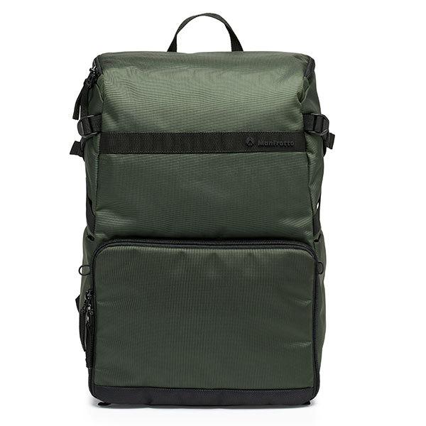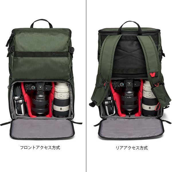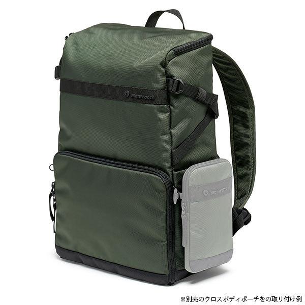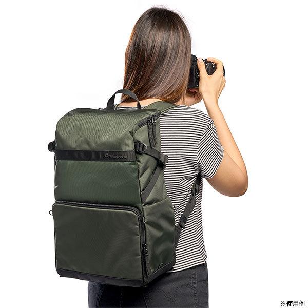 ・レンズを装着したままのカメラと2本の交換レンズを収納可能なカメラコンパートメントは取り外しが可能で、普段使いのバックパックとしても利用することができます。また、14インチまでのノートパソコンに対応したスリーブも、取り外して単独で使用することができます。一方、スマートフォンや小物類の収納に便利な別売のクロスボディポーチをバッグの両サイドに取り付けて、収納力をアップグレードすることも可能です。」・カメラコンパートメントには、薄手でも衝撃吸収性に優れる高密度EVA発泡体*を利用した、最新のマンフロットプロテクションシステム「M-Guard.」を採用しています。・カメラコンパートメントの取り付け方向とノートパソコン用スリーブの取り付け位置を変更することによって、機材の出し入れ口をフロントアクセス方式とリアアクセス方式のどちらにも切り替えることができます。[主な仕様] 外寸:高さ43cm x 幅29cm x 奥行18cm容量:約12L重量:0.8kg材質:合成繊維カラー:ダークグリーン[Manfrotto Street MBMS2BP カメラバッグ カメラバック カメラリュック 写真屋さんドットコム]