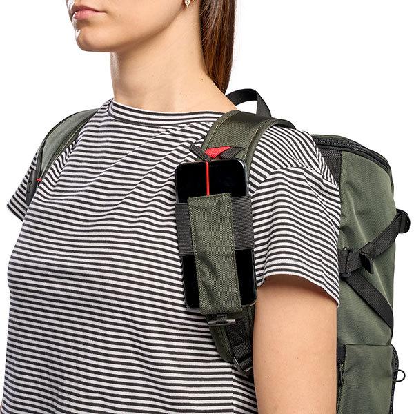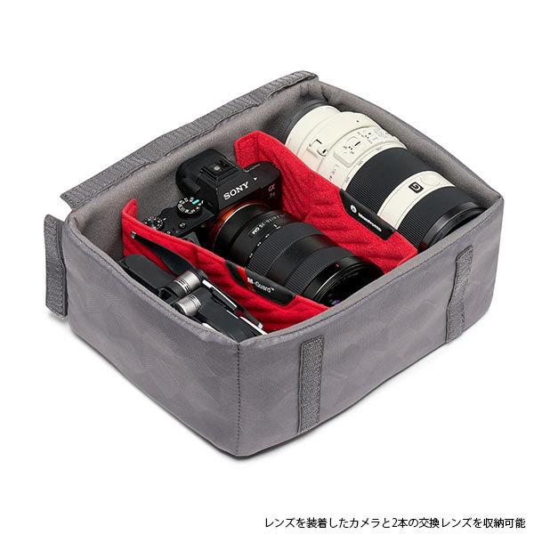 レンズを装着したままのカメラと2本の交換レンズを収納可能なカメラコンパートメントは取り外しが可能で、普段使いのバックパックとしても利用することができます。また、14インチまでのノートパソコンに対応したスリーブも、取り外して単独で使用することができます。一方、スマートフォンや小物類の収納に便利な別売のクロスボディポーチをバッグの両サイドに取り付けて、収納力をアップグレードすることも可能です。