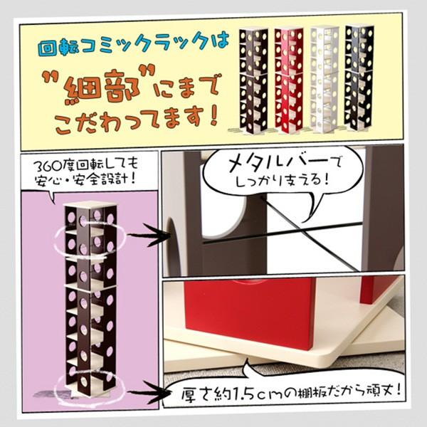 回転式の本棚!回転コミックラック(7段タイプ)強度アップしたキングオブコミックラック!くるくる回る回転式なので探しやすい!機能性とデザイン性を両立!コミックだけでなく、CD・DVDや雑貨なども収納できます!■サイズ:外寸:幅47x奥行47x高さ168cm内寸:(約)幅30x奥行30x高さ22cm(1フロア/4面共通)※商品重量:(約)20kg■カラー:ダークブラウン ホワイト レッド ブラック■素材:構造部材:MDF/ 表面加工:ウレタン樹脂加工■その他:お客様組立商品です※耐加重:棚板1枚につき約10kg【送料無料】※北海道/沖縄/離島のお届けに別途送料が必要となります。コミック収納 マンガ 収納 DVD収納 DVDラック DVD収納ラック CDラック CD収納棚 CD収納ラック おしゃれ 大容量 大量収納 ディスプレイ 棚 CDストッカー DVDストッカー 本収納 漫画収納 回転本棚 スリムラック 書棚 本棚 コミックラック 7段【完成品】回転ラック 回転式 回転 ハイタイプ CD収納 マンガ収納 漫画 ディスプレイ本棚 コミックラック リビング"}