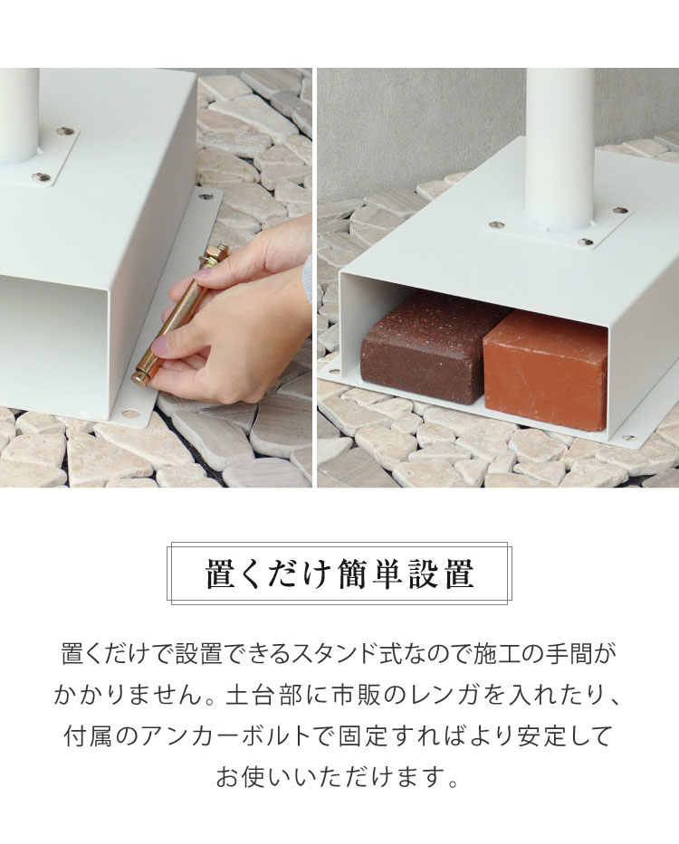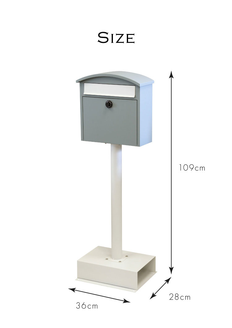 【商品サイズ】幅36×奥行28×高さ109cm【素材】金属(鉄) 【重量】7.1kg【生産国】中国【投函可能サイズ】茶封筒角型2号【付属品】地面固定用アンカーボルト【備考】ガルバナイズド処理粉体塗装組立品【特徴】置くだけで使用可能なスタンド式。壁掛け式とは異なり面倒な施工の手間がかかりません。茶封筒角型2号が投函可能です。鍵付きなので防犯面に安心です。※ダイヤルロックはお客様で好きな番号へ変更は出来ません※郵便取出口は、扉が最大約75°くらいまでにしか開かない構造ですので、郵便取出し時に、郵便物落下の心配がありません。土台部は、標準サイズのレンガ(21×10×6cm)を最大3個入れることが可能です(横向き×2、縦向き×1)。錆びにくい加工:ガルバナイズド処理を施しているため、錆びにくくなっております。地面固定用のアンカーボルトが付属します。土台部にアンカーボルトを打ち込む穴があり、地面とポストを固定することも可能です。【特長】ホテル、旅館、新築、戸建て、新生活、一人暮らし、施設、テレワーク、在宅、業務用、おすすめ