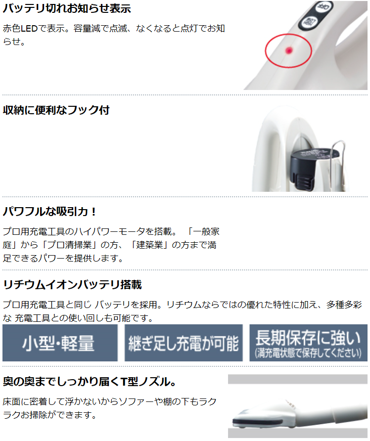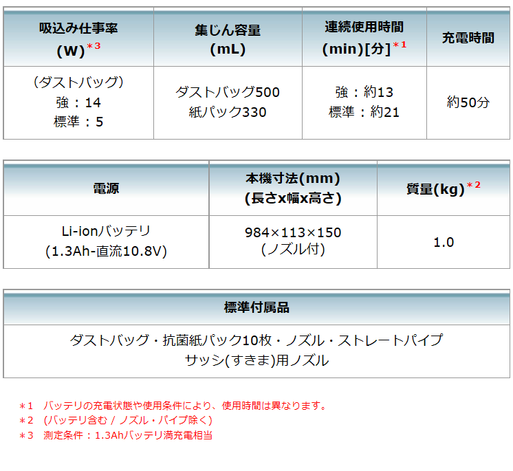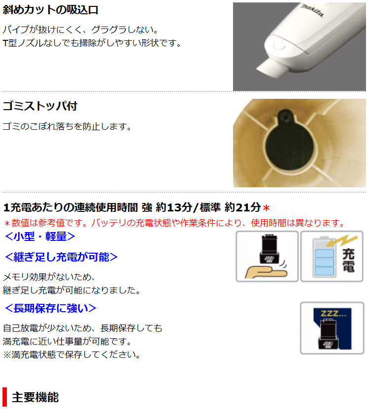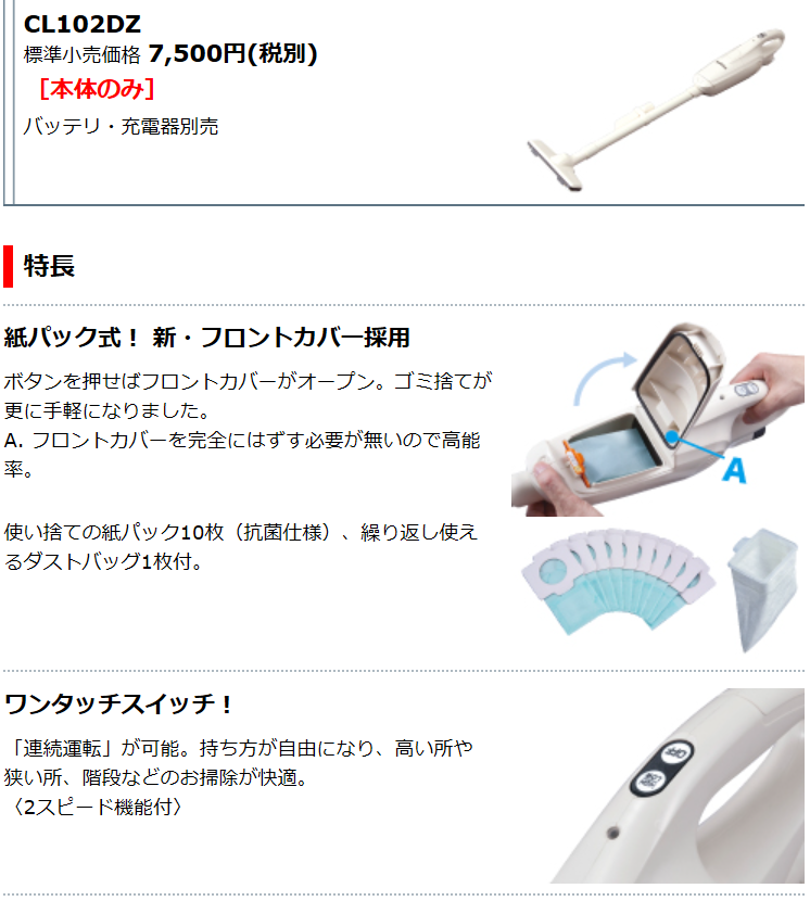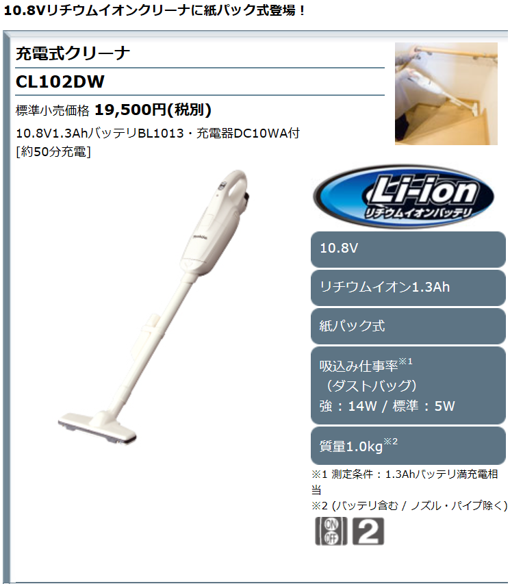 注)お買い物ガイド(パソコン版)を必ずお読み頂き、ご理解・ご納得された上ご注文をお願い致します。■マキタ 10.8V-1.3Ah充電式クリーナ CL102DW※本体・バッテリBL1013・充電器DC10WA付になります。※外箱には、輸送・保管伴う傷みがある場合が御座います仕様 集じん容量(mL) ダストパック 500 紙パック 330 連続使用時間(min)[分]※ 強:約13 標準:約21質量(バッテリ含む/ノズル・パイプ除く)(kg) 1.0※数値は参考値です。バッテリの充電状態や作業条件に異なります。標準付属品抗菌紙パック(10枚)・ノズル・ストレートパイプサッシ(すきま)用ノズル・ダストパック※こちらの商品は取扱説明書末尾に保証書記入欄が御座いますが、当店では記入捺印を略させて頂いております。(当店発行の納品書を保管頂ければメーカー1年保証の対象となります) 商品に何か問題が御座いましたら当店までご連絡下さい。