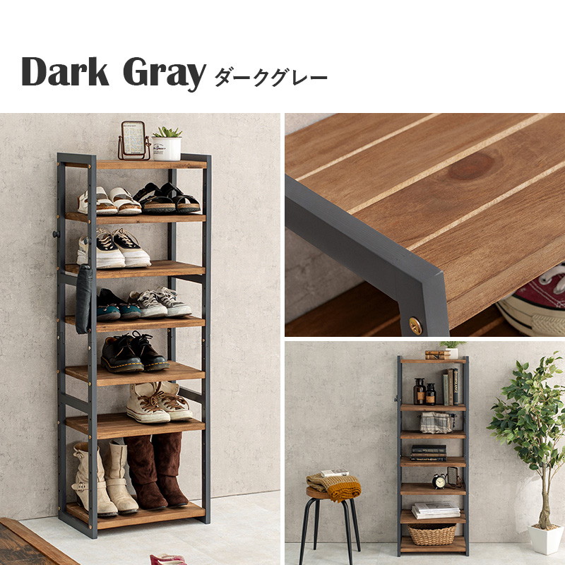 ■商品説明●サンダルからブーツまで、靴の高さに合わせて棚の高さを組み換えできるシューズラック。●靴が見やすく取り出しやすいオープンタイプ。●棚板が可動棚になっているので、好きな高さに調節することが可能です。●オープンタイプなので靴が見やすく風通しが良くニオイがこもりません。●最大16足の靴が収納できる収納力。●ロングブーツやハイカットシューズなど高さのある靴にも対応。●サイド部分には傘や小物を引掛けておくことができるフックが2個付いています。●棚板には天然木パイン材を使用しており、飽きのこないシンプルなデザインでどんなお部屋にも自然に馴染みます。●シューズラック以外にもリビングのオープンラックや収納棚としてもおすすめです。●豊富なサイズ展開でスペースに合わせてお選びください。組み合せての使用にも最適です。■商品詳細カラー:ダークグレー/ホワイトウォッシュ生産地:中国製サイズ(約):幅45(フック含む47)×奥行28×高さ128cm素材:主材:天然木(パイン)可動棚:7枚(6cmピッチ)組立:お客様組み立て式