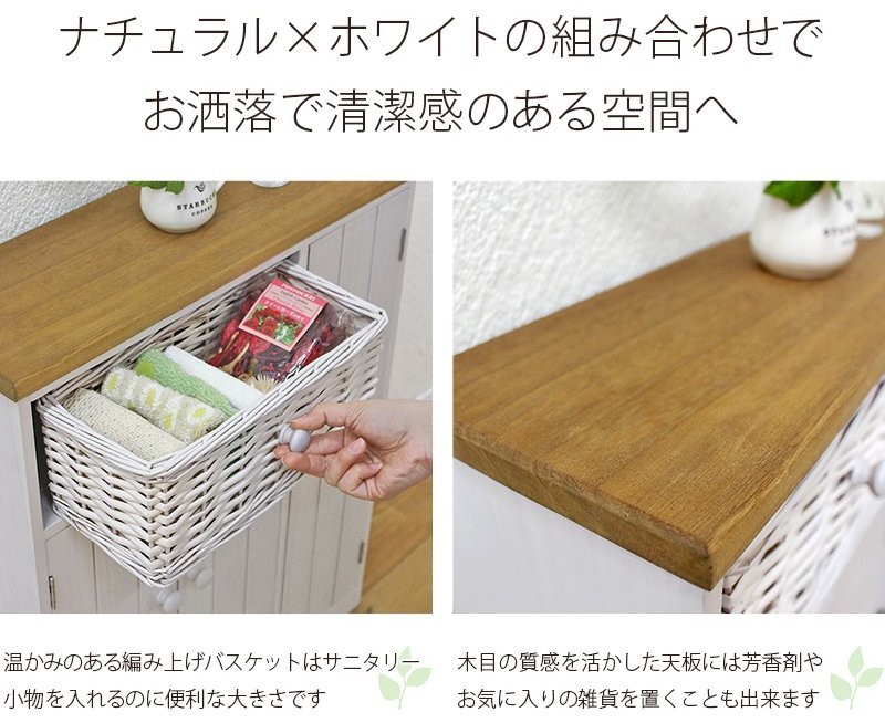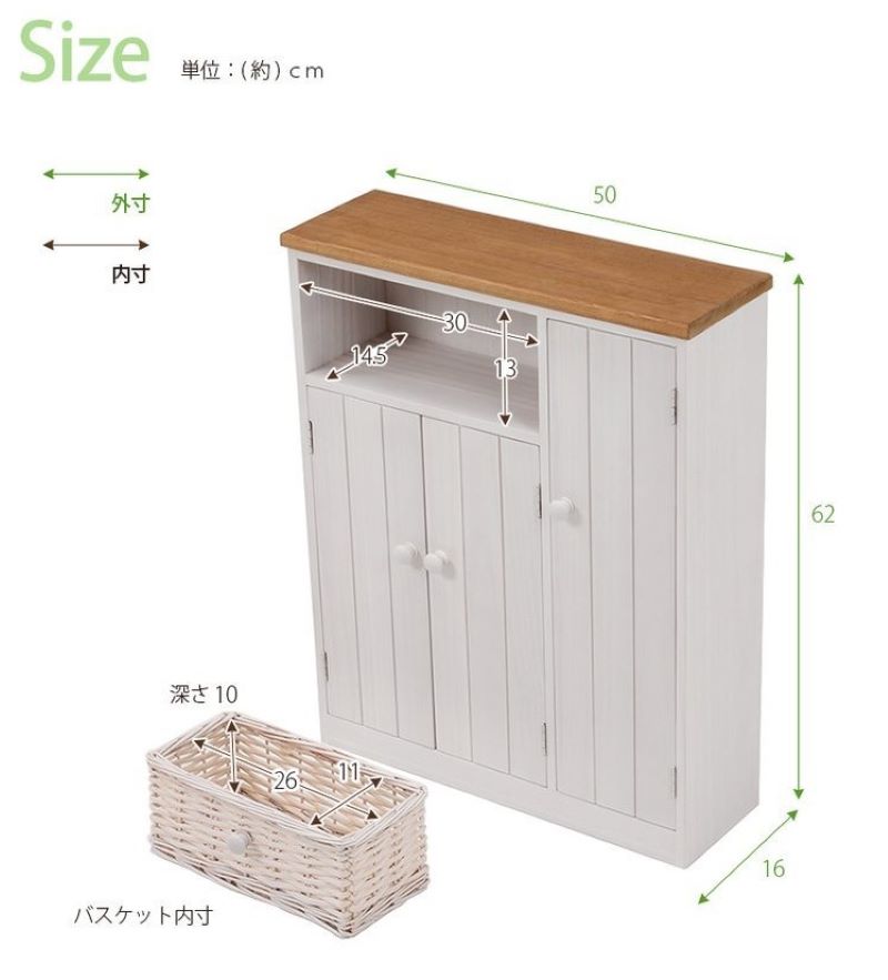 ■サイズ:(約)・本体:幅50×奥行16×高さ62cm・バスケット内寸:(約)幅26×奥行11×深さ10cm・扉内内寸(小):(約)幅14×奥行12×高さ(上)26・(下)27cm・扉内内寸(大):(約)幅29×奥行12×高さ40cm・可動棚(扉・大):1枚・3cmピッチ3段階■素材:・本体:桐材、柳■生産国:中国