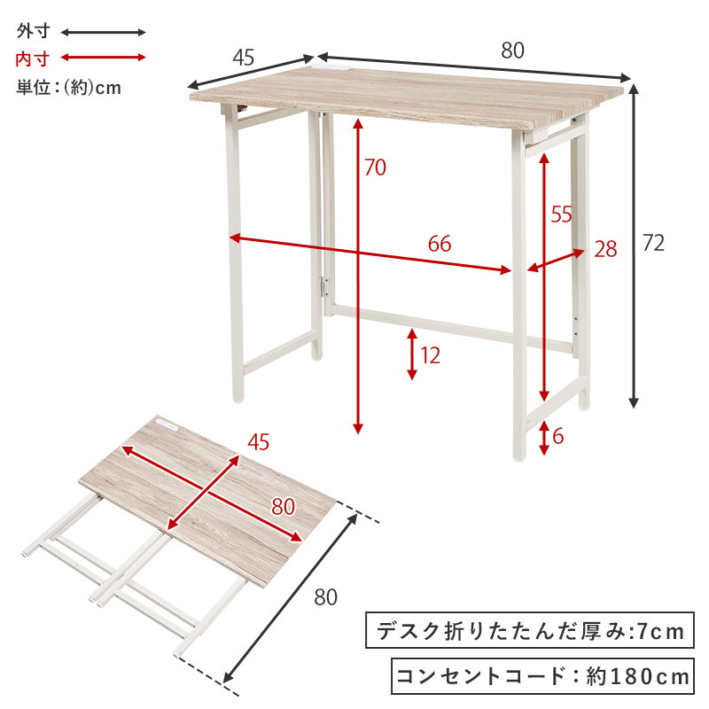 ■商品説明●必要な時だけ広げて、たたんで収納できるデスクチェアセット。●天板にコンセントがついていてパソコン作業にも便利です。●ヴィンテージ感漂うデザイン性高いお洒落な木目調シートを使用。●エンボス加工を施すことで木目の質感もリアルに再現。置くだけで雰囲気の出るアイテム!●新生活を始める一人暮らしの学生さんや社会人の方にもおすすめのワンルームにも置きやすいコンパクトなサイズ感。●パソコンを置いて十分に作業ができる天板サイズになっています。●天板部分には2口コンセントが付き。スマホを充電しながらパソコンやプリンターなどを同時に使用可能です。■商品詳細サイズ(約):デスク:(約)幅80×奥行45×高さ72cmチェア:(約)幅44×奥行46×高さ78.5×座面高46cm素材:主材:スチール・化粧繊維板(塩化ビニル)、張地:合成皮革組立:お客様組み立て式備考:折りたたみ式、2口コンセント付き