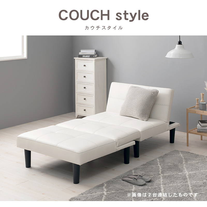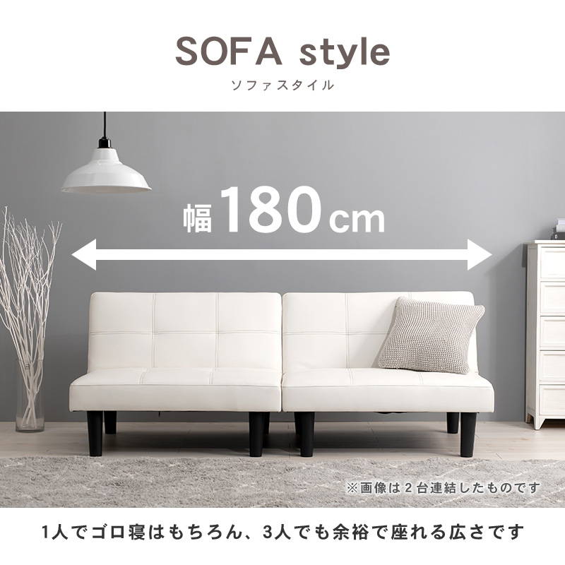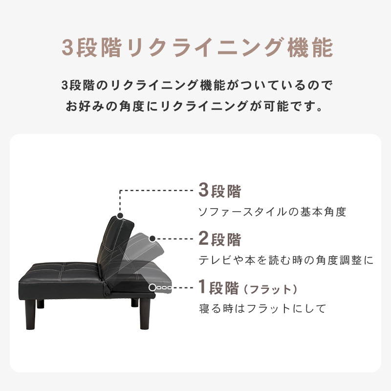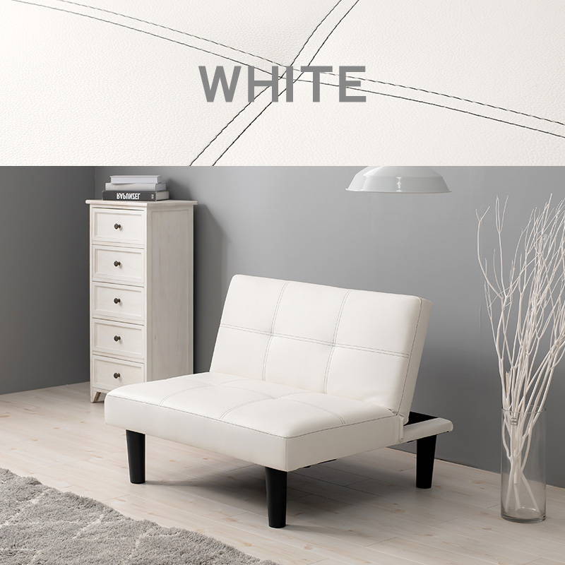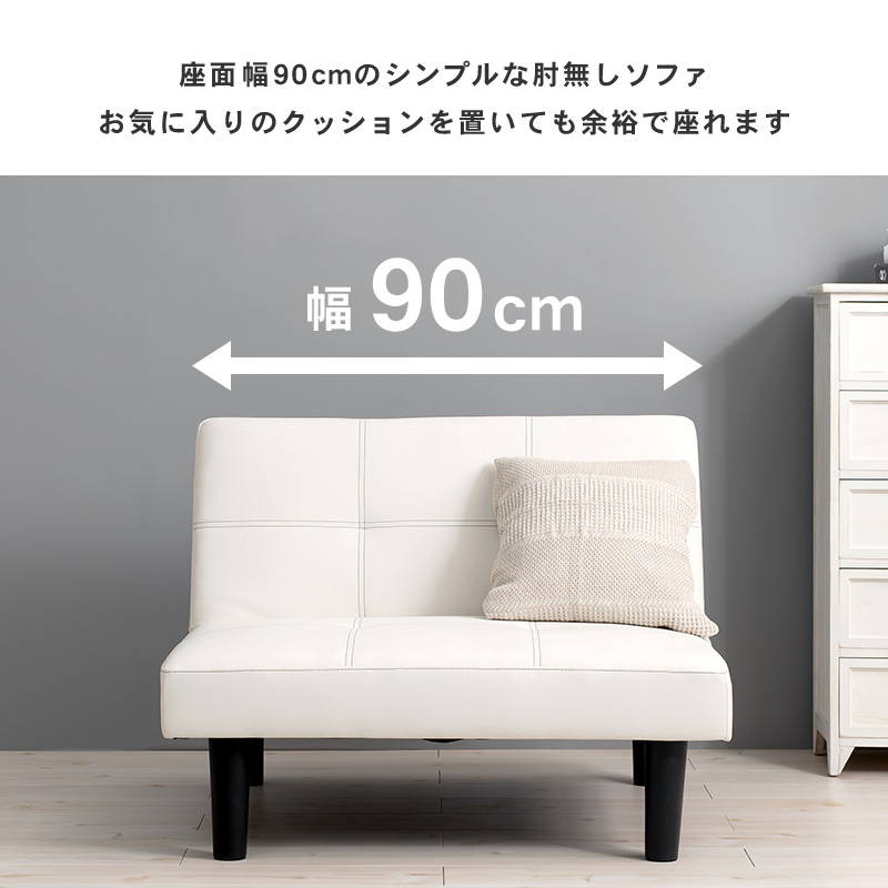 ■商品説明●シンプルなデザインのおしゃれな肘なしソファ。●高さを抑えた設計で圧迫感を感じにくくなっています。●幅90cmでゆったりと座ることができます。●背もたれ3段階リクライニング仕様。●連結も可能!2台連結でソファベッドにも早変わりです♪●ソファ裏には連結用のジョイントテープがあるので簡単に連結することができます。●ソファの脚は外すことが可能なので、簡単にロータイプのソファにすることが可能です。●張地には水や汚れに強いPVC素材を使用。サッと拭くだけで簡単お手入れができます。■商品詳細カラー:ブラック/ホワイトサイズ(約):幅90×奥行86〜91×高さ68〜32×座面高32cm素材:構造部材:天然木、脚部:塩化ビニール樹脂、張地:合成皮革