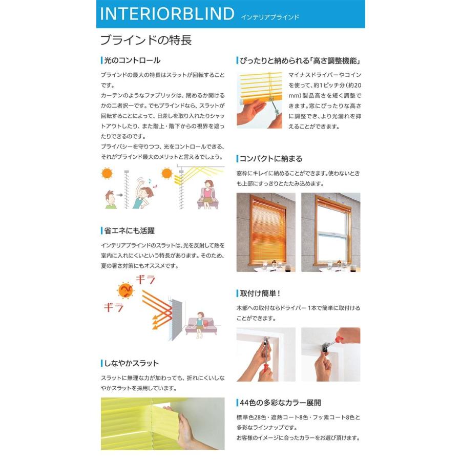 ※北海道・沖縄県・その他離島地域は別途送料がかかります。カーテンにはない、光の微妙なコントロールが可能なブラインド。クールでシャープな機能性に、ソフトなアースカラー、ビビッドな原色系もプラスした28色のラインナップからお選びいただけます。また、太陽の反射率を高め、室内への熱の侵入を少なくする遮熱コートスラット8色も追加しました!※ 最大製作可能面積は 6平方メートル です。※ カーテンレールに取付をご希望のお客様は別途ビスが必要となりますので、備考欄に「レールビス必要」と明記して下さいませ。