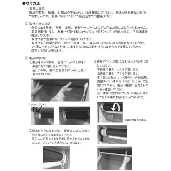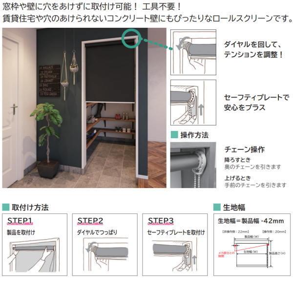 ネジ止め不要つっぱりロールスクリーン登場窓枠や壁に穴をあけずに取り付け可能!工具不要。賃貸住宅や穴のあけられないコンクリート壁にもぴったりなロールスクリーンです。最高級の遮光性能をそなえたラインナップ。光や視線をシャットアウトしたい、モダンな空間におすすめです。※生地裏面はすべてソフトホワイトになります。生地生成:ポリエステル 100%生地重量:0.39kg/平米生地透過性:遮光付属品(1袋にまとめていれます)・両面テープ2枚・取付けレンチ1個・太鼓鋲4本・コードクリップ1個 ※製品に取付け・セーフティプレート1組●仕上り寸法・W+7mmご注意事項
