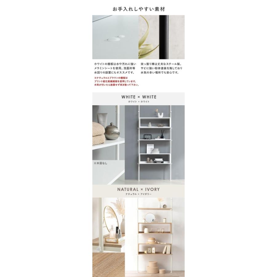 特徴ボックス収納とオープン棚でおしゃれにディスプレイできる、突っ張りラック。高さ無段階調整可能。■組立式■BOX棚×2・棚板×1素材 / サイズ / 容量サイズ(約)幅90×奥行24×高さ187〜264cm素材フレーム:スチール、棚板:(SW)メラミン樹脂化粧繊維板 (WH・BR)プリント紙化粧繊維板"}