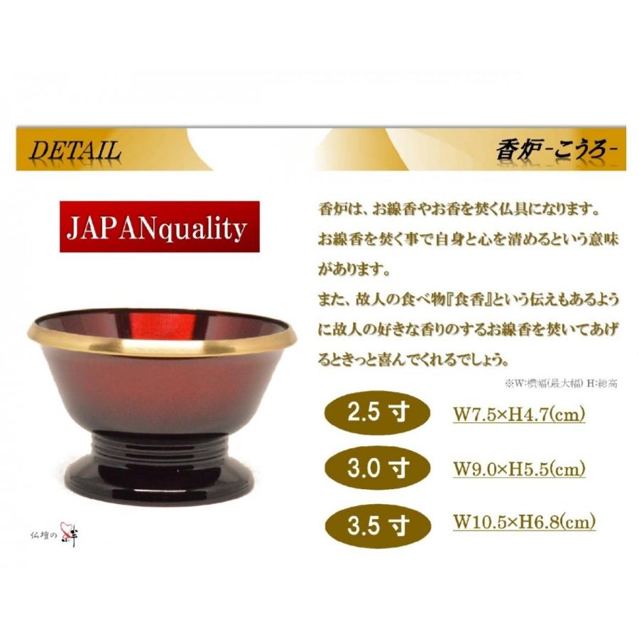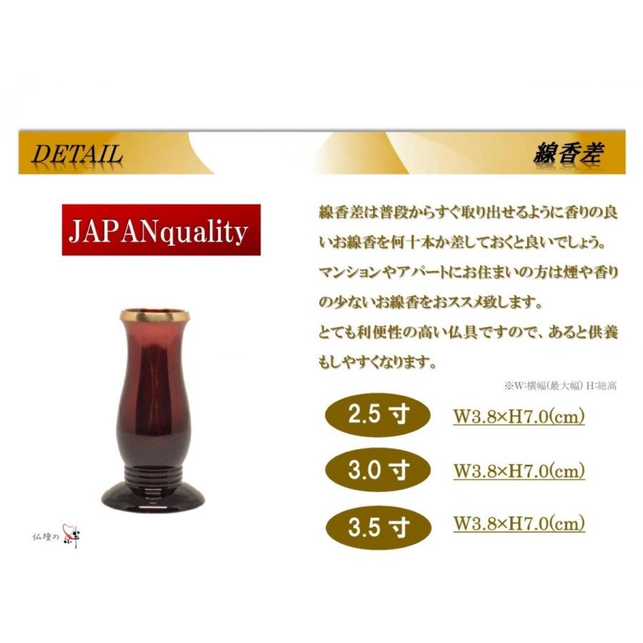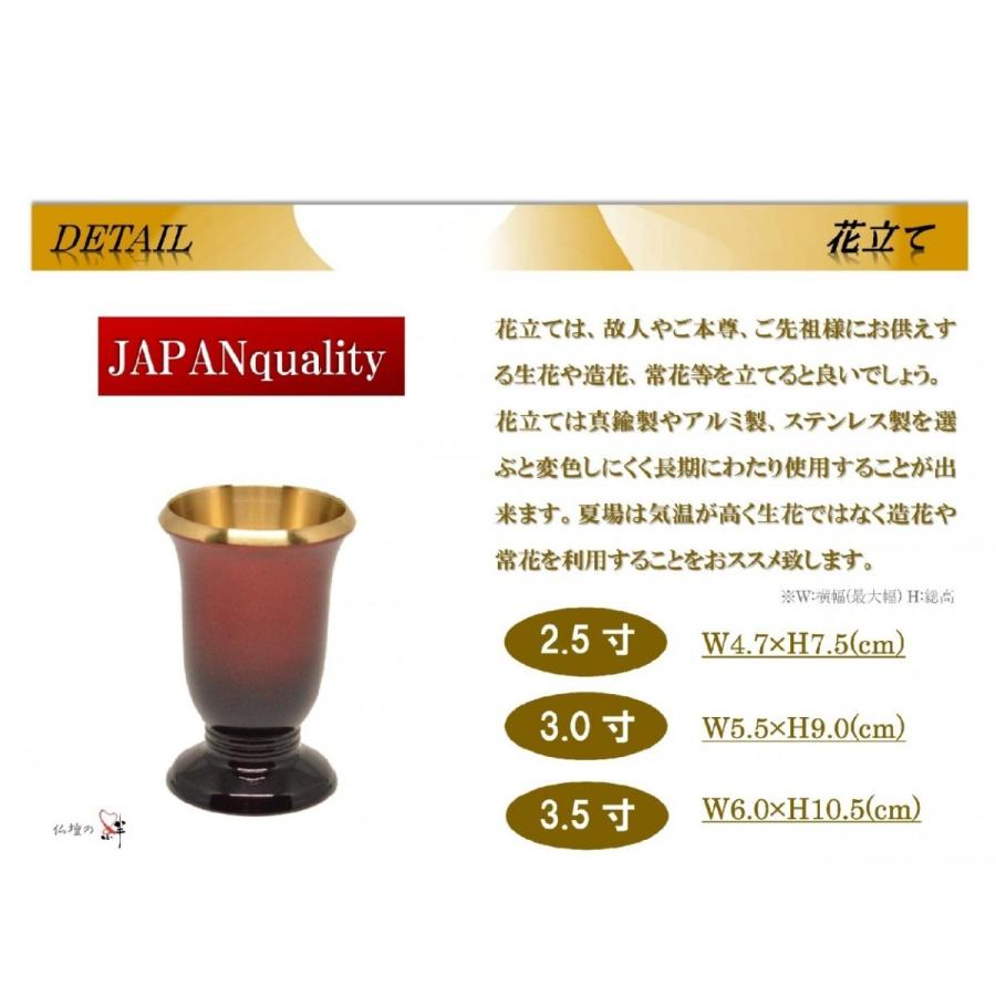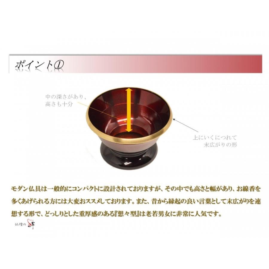 ■商品名:『想々型』■材質 :真鍮製&ステンレス■仕様 :樹脂塗装■サイズ:2.5寸■カラー:ワインレッド色(黒グラデーション加工)■生産地:日本(高岡)●●●全国送料無料●●●【商品詳細】――想々型――殺菌効果と錆に強い真鍮で作られた仏具になります。女性に大変人気のワインレッドカラーに下にいくにつれ黒のグラデーションぼかしを入れ非常に上品に仕上がっております。開口部分にいくにつれ末広がりになっておりとても縁起の良いデザインです。滑らかな曲線と金のラインがスタイリッシュにお仏檀をより引き立たせてくれます。非常に丈夫で作られた真鍮製仏具は末永くご利用頂けます。●●●検索ワード●●●高級仏具、モダン家具調仏具、高岡仏具、国産、日本製、送料無料、真鍮製、ステンレス、2.5寸、3.0寸、3.5寸、安い、格安、仏具一式、仏具セット、位牌、仏壇、セット、仏像、掛軸、最安値、おりん、りん棒、花立、線香差、仏飯、茶湯器、供物、常花、膳、灯立、火立、火消、マッチ消、防火マット、灯篭、提灯、お盆、真言宗、天台宗、浄土宗、曹洞宗、日蓮宗、臨済宗、浄土真宗、十三仏、経机、ローソク、蝋燭、お線香、花瓶、掛軸立
