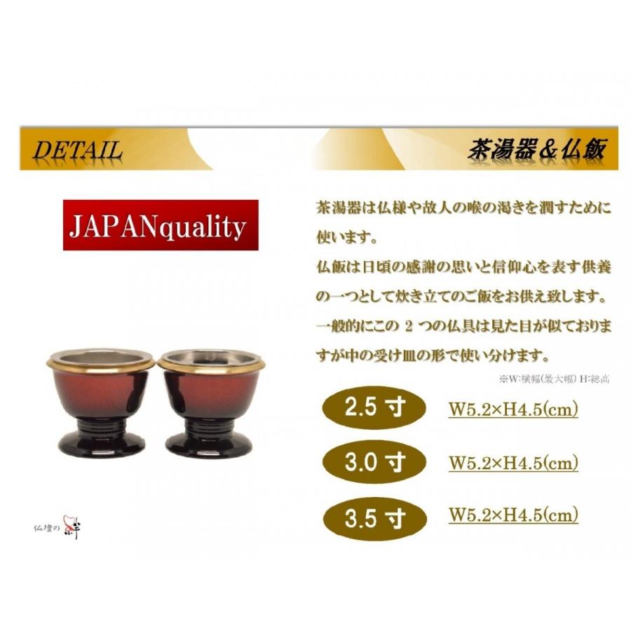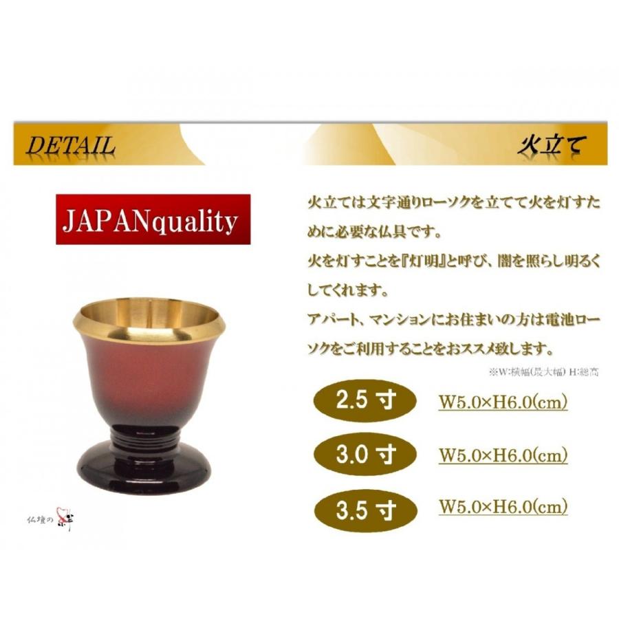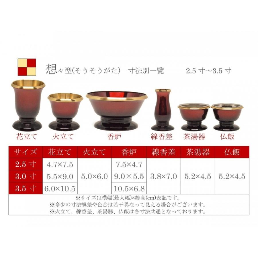 | ※サイズは横幅(最大値)×総高(cm)表記です。 ※多少の寸法誤差や色合いは若干異なって見える場合がございます。 ※火立て、線香差、茶湯器、仏飯は各寸法共通となっております。 | ||||||