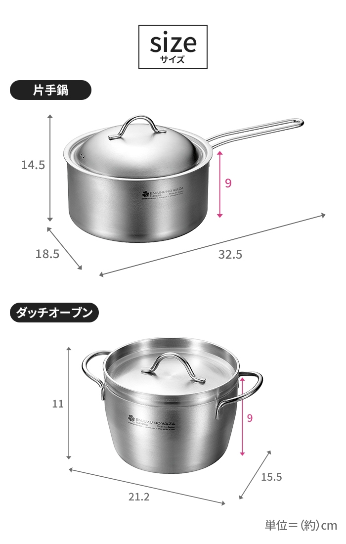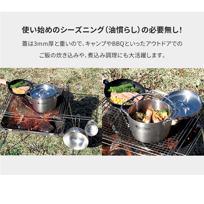 鍋の本体は、熱伝導性に優れたアルミニウムを耐久性と保温性に優れたステンレス鋼でサンドした3層構造(3LAYERS)。使い始めのシーズニング(油慣らし)の必要が無く、軽量で扱いやすいです。IHはもちろん、ガス火やオーブン調理、アウトドアでの焚き火や炭火にも対応します。ハンドルと蓋をオールステンレス製にすることで割れる心配もなく、耐久性に優れお手入れも簡単でそのままオーブンに入れての調理や食洗機にも対応します。▼ 製品サイズ[片手鍋]約幅18.5×奥行32.5×高さ14.5cm(本体高さ:9cm)[ダッチオーブン]約幅15.5×奥行21.2×高さ11cm本体高さ:9cm(蓋・ハンドル含む)ツル含む高さ:20cm▼ 重量[片手鍋]約920g[ダッチオーブン]鍋:約570g、蓋:約580g▼ 容量[片手鍋]約2.2L[ダッチオーブン]約1.4L▼ 材料[鍋本体]ステンレス鋼、アルミニウム(三層構造)(底の厚さ2.0mm)[蓋・ハンドル]ステンレス鋼▼ 特徴・機能ガス・100V・200V IH調理器OK▼ 内容セット用品▼ 組立区分完成品▼ 生産国日本製▼ 注意事項※ハンドルは調理中・調理後は熱くなりますので、ミトンや鍋つかみを使用してください。▼ 備考ダンボール箱入