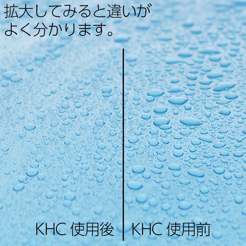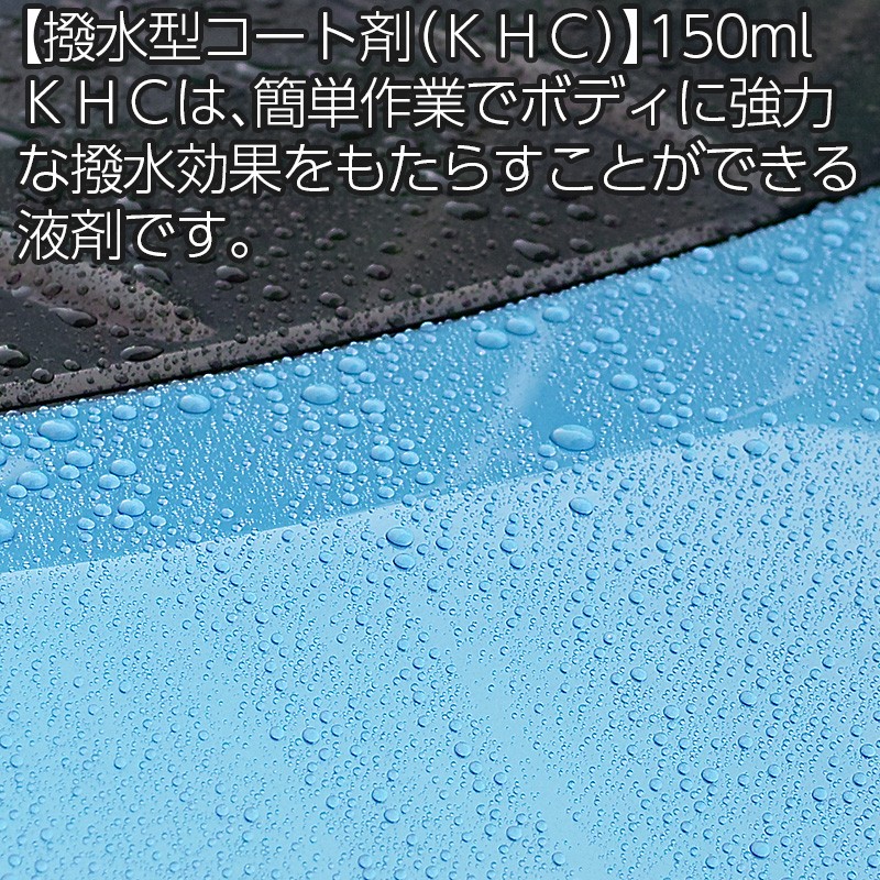 KHCは、簡単作業でボディに強力な撥水効果をもたらすことができる液剤です。洗車後にボディに残っている水分を利用して、原液を薄めながら作業します。持続期間は1〜2ヶ月ほどですが、いわゆるコロコロ撥水がお好みの方には適したコート剤になります。【名称】KHC 撥水型コート剤【用途】自動車塗装面等の艶出しおよび撥水コート剤(全色対応)【成分】シリコーンレジン・シロキサン化合物・界面活性剤・その他【種類・形式】弱酸性・液体【内容量】150ml【特徴】・洗車後の濡れたボディに塗って拭くだけの簡単作業。・レジン配合被膜形成型コーティング剤【使用方法】(1)ボディに砂やホコリが付着している場合は、洗い流してから使用してください。(2)スポンジに液をつけ、まんべんなく塗り込みます。(3)水拭きと乾拭きを交互に行い拭き上げて完了です。