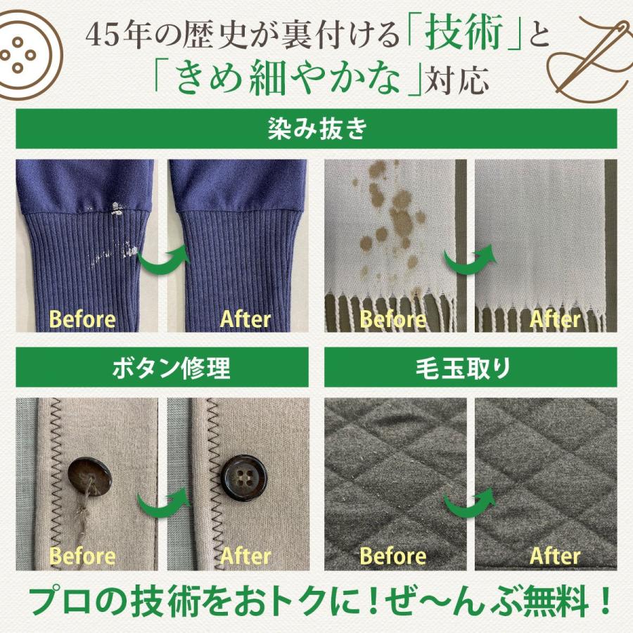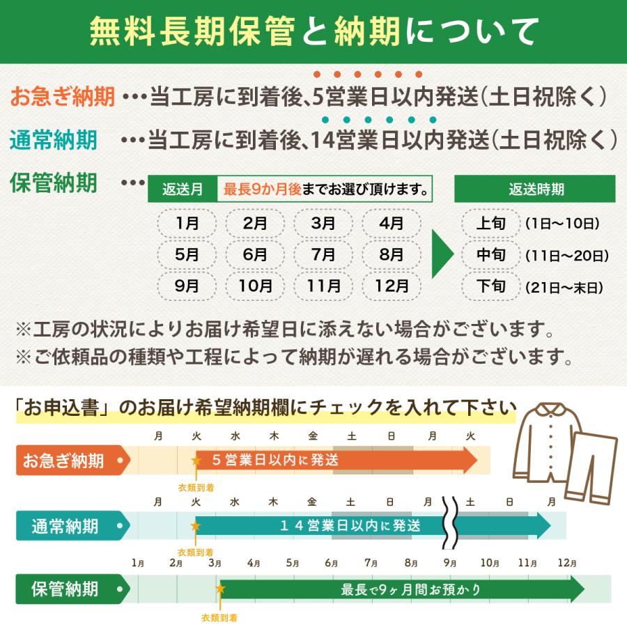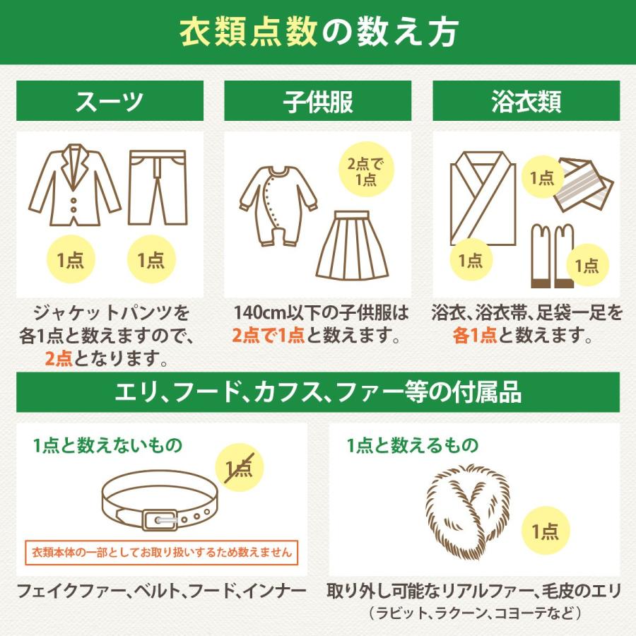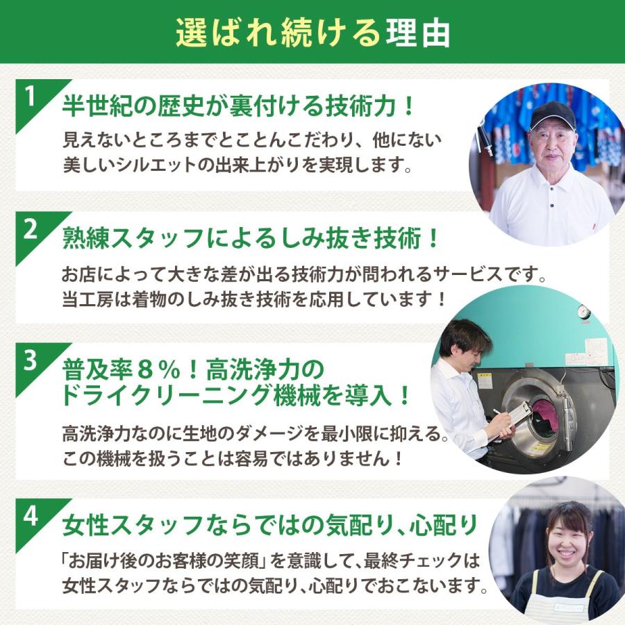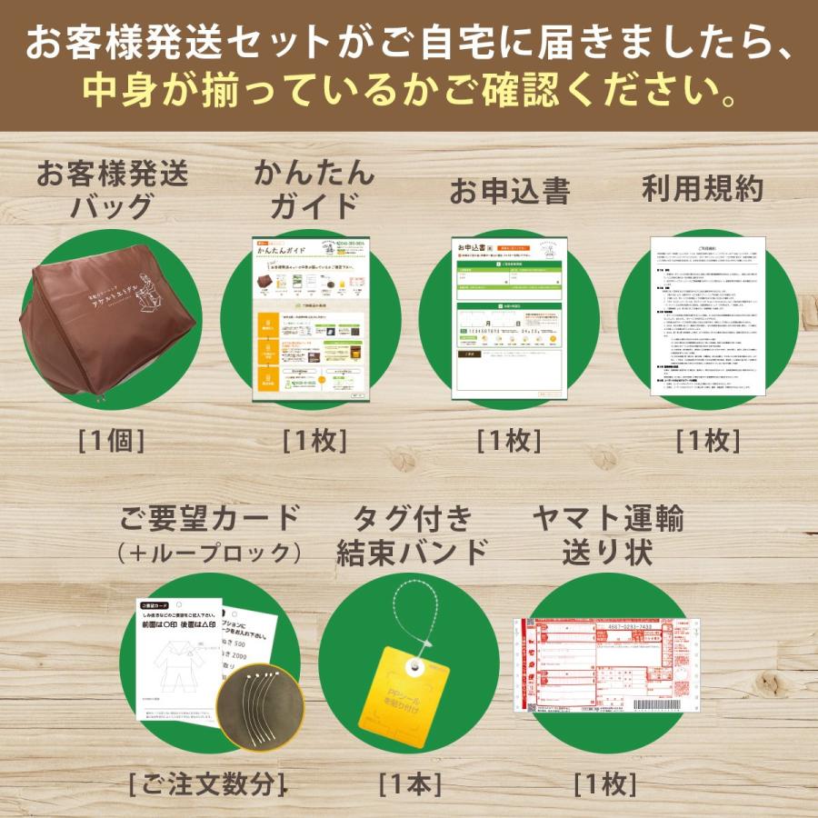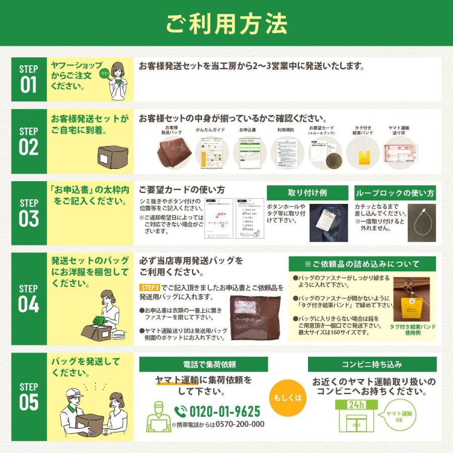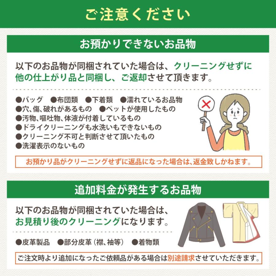 ※現在、最短納期は工房到着後14営業日以内発送となります。★こちらは7点パックです。衣類など7点まで丁寧にクリーニング致します。★高級ダウンやコート類などを入れても追加料金はございません。★無料保管は最長9ヶ月間お預かり致します。 ※ご希望納期は、お客様発送セットのお申込み書にご記入下さい。★発送バッグの寸法は縦45cm横50cm高さ40cmの大容量サイズです。★当工房は希少な高洗浄力、高級無臭ドライクリーニング機を使用しています。■オプション加工【汗ぬき加工】ドライクリーニングでは落とすことの出来ない、汗をきれいに落とします!【カビ取り加工】強力除カビ剤を配合した洗剤で、根こそぎカビを除去致します!●ご利用の流れ1.スマホやPCからご注文ください、お客様発送セットを3営業日以内に発送いたします。 ※ヤマト運輸「ネコポス」でご自宅のポストに投函されます。2.「かんたんガイド」をご確認の上、発送バッグにお洋服をお詰め下さい。3.ヤマト運輸に集荷依頼をお願い致します。 (フリーダイヤル0120-01-9625 携帯から0570-200-000)4.工房に品物が届きクリーニング致します。5.ご希望日に丁寧に梱包してお届け致します。