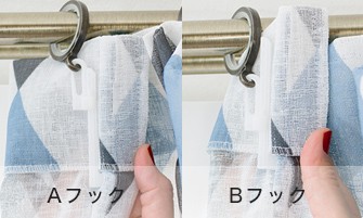 カーテンレールが見える状態をAフック、隠れる状態をBフックと呼びます。ほぼ5mm間隔で4cm程度裾を上げ下げすることができます。